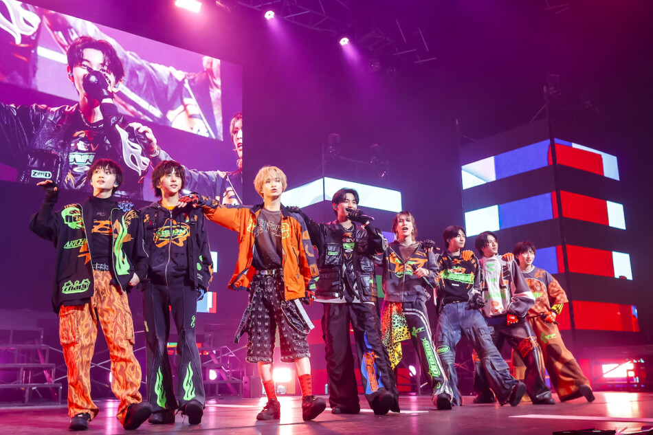竹野の「後半戦も盛り上がっていけますか!」のかけ声から、パフォーマンスを再開。中村が颯爽と舞台上に登場し、軽やかでキレのあるソロのダンスパフォーマンスを披露してから、ダークな雰囲気の漂う「ナイトフライト」のステージへ。全身をしなやかに使いつつも、パワフルな表現も両立させる中村のダンスの実力を終始堪能できた一幕となった。その後、「Cyber Groovin’」では、八神にスポットライトが当たる。ファンキーでダンサブルな音楽に合わせて、八神の伸びやかで表現力豊かな歌声が響くと、軽やかなステップを披露するメンバーの姿が相まって、自然と体を動かしたくなる不思議なグルーヴ感がうまれていく。そして、筒井がひな壇を使ったバク転など、アクロバティックなパフォーマンスで会場を沸かせると、「Play The Music」をパフォーマンスした。阿久根が得意とするボイスパーカッションから始まったのは「ビリミ」だ。疾走感あるサウンドの中で8人がクリアな歌声を響かせると、間奏部分では「ICEx!」のコール&レスポンスを楽しむシーンも見られ、コンサート終盤に向けて会場の熱をさらに高めていった。