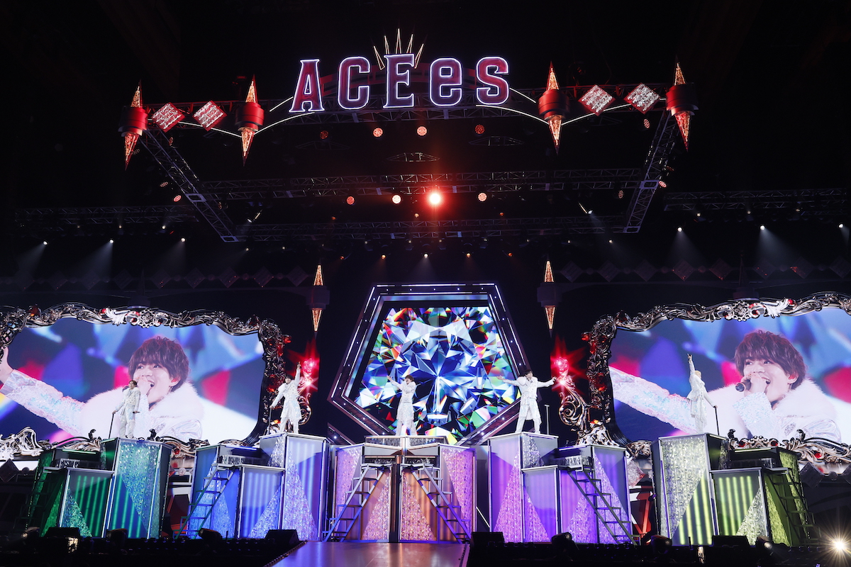 特効を派手に使う「Dangerholic」(Snow Man)やセンターステージからバックステージまでメンバーが広く動き回る「人生遊戯」(timelesz)で序盤からギアを上げていく。「SHE! HER! HER!」(Kis-My-Ft2)の最後には一人ひとり挨拶をし、那須は「俺たちACEesに初めて会ってどう? ビジュアル強すぎんだろ!」と煽る。続けて「このライブにすべてを捧げてきました! 『ACEesってどんなグループだろう?』ってみんなドキドキしてると思います。俺たち5人が最高のグループであることを、皆さんにこのステージの上からちゃんと伝えます」と誠実な意気込みを話し、「ダイヤモンドスマイル」(なにわ男子)に繋げた。