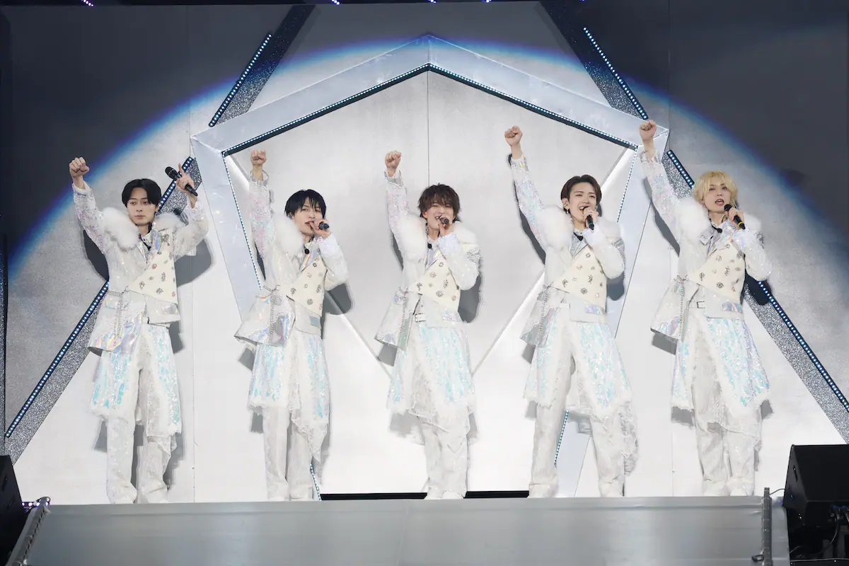 上品で煌びやかなツアーロゴやグッズデザインに加え、サブテーマに“ビジュー”を据えた本ツアー。オープニング映像では浮所飛貴はトパーズ、那須雄登はサファイア、作間龍斗はアメジスト、深田竜生はエメラルド、佐藤龍我はシトリンというメンバーカラーにちなんだ宝石が一人ひとりのビジュアルとともに映し出された。まるでボックスの蓋が開くようにステージが動くと、満を持して5人が登場。ファーの付いた白い衣装を身に纏い「感謝カンゲキ雨嵐」(嵐)で幕を開けた。