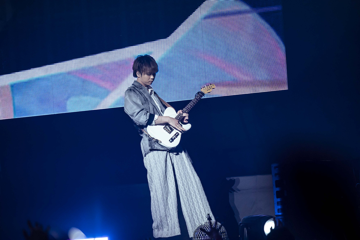 エモさがたっぷり込められた右京のMCの後は、「ミックス」。LEDにカラフルな映像が映され、ハンドマイクの右京は「日本武道館、めちゃくちゃ楽しみにしてた人!?」とオーディエンスに呼びかける。shujiがギターソロを弾きはじめると、吉田が背後から軽くバックハグ。当然、「キャー!」という歓声が巻き起こる。さらに疾走感溢れる「恋焦がれて」を重ね、オーディエンスのテンションはさらにアップ。メンバー自身もこの大舞台を全身で楽しんでいるようだ。