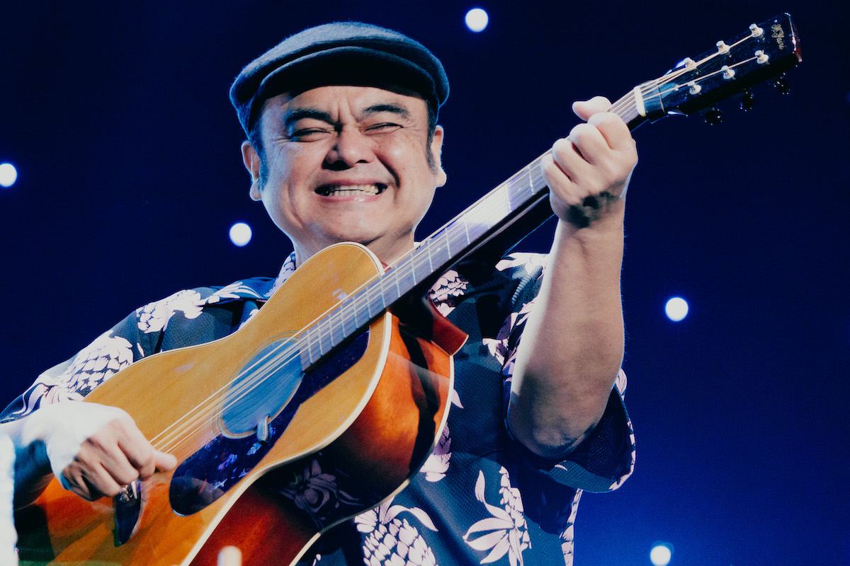 沖縄県・石垣島出身の3人組バンド、BEGINのデビュー35周年を記念した公演、『さにしゃんサンゴSHOW !! 』が3月30日、日本武道館で開催された。彼らが本会場でライブを開催するのは、2011年以来14年ぶりで、これが3回目となる。チケットは即完し、1万人の観客が集まった。直前の22日には大阪城ホール公演も開催されており、合わせて2万1000人が35周年を祝ったことになる。比嘉栄昇(Vo)、島袋優(Gt / Vo)、上地等(Key / Vo)というBEGINの3人がステージに登場すると、歓声と拍手とともに、指笛も鳴り響いた。指笛は沖縄の音楽には欠かせない表現で、エイサーや祝いの席で用いられているものだ。「今日は皆さんがBEGINです。皆さんを喜ばせるために、お祝いの宴を開きます」と比嘉が挨拶をして、ライブが始まった。