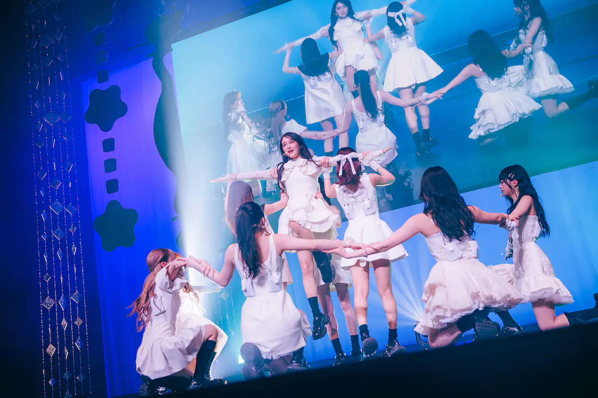 ショーケースでは、会場が暗転すると、ステージがピンクと紫のグループカラーの照明に彩られ、メンバーが登場。まずはタイトル曲「MUSE」をパフォーマンスした。MVでも着用していた純白の衣装に身を包んだメンバーたち。軽やかに華やかに、それでいてキレのあるダンスを繰り広げていく。会場からは、音楽に合わせてメンバーの名前をコールするYOU:ME(ファンの呼称)の歓声も響き渡った。キャッチーで覚えやすい“お化粧ダンス”も含め、デビューから1年でさらに磨かれた表現力豊かなステージは圧巻。冒頭から会場を大きく盛り上げていく。