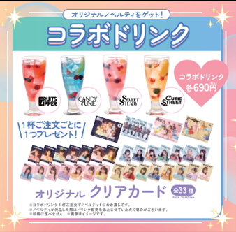 本コラボの期間中、ビッグエコー4店舗では、それぞれKAWAII LAB.各グループ(FRUITS ZIPPER、CANDY TUNE、SWEET STEADY、CUTIE STREET)のコラボルームを設置。また、ビッグエコー26店舗とカラオケマック5店舗では、各グループのクリアカードがもらえるコラボドリンクが販売される。