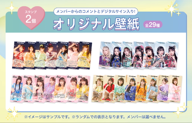 スタンプ2個:メンバーからのコメントとデジタルサイン入りオリジナル壁紙(全29種・応募者全員)※ランダム配布。
