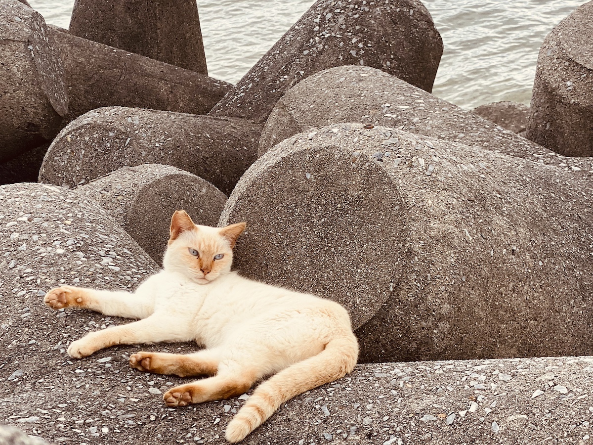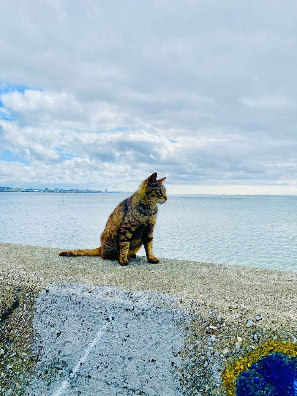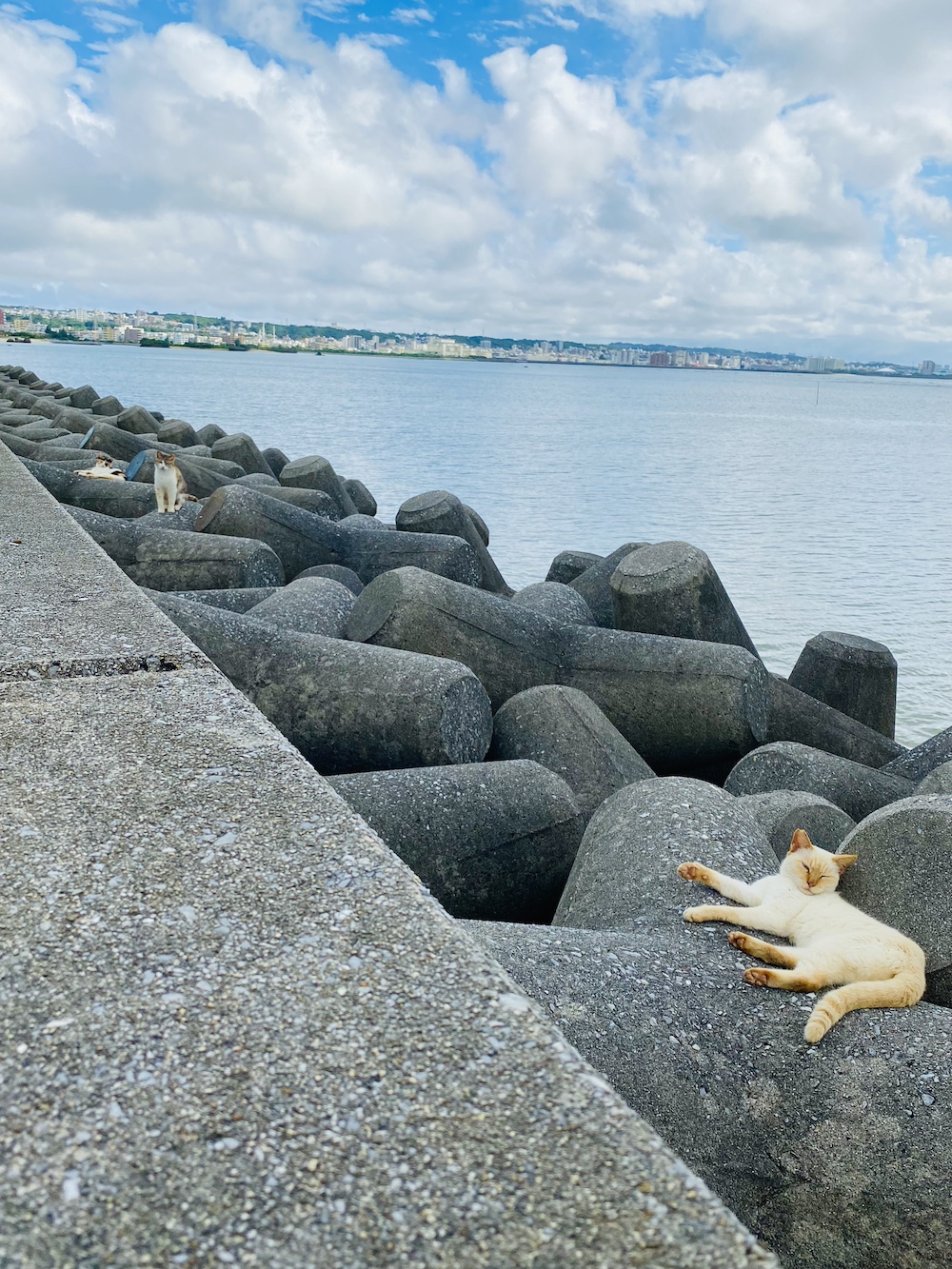 その後は、アメリカンビレッジ近くにあるサンセットビーチを、何をするでもなくボーッと散歩。「猫の道」と呼ばれる、猫がたくさん現れる散歩道が近くにあるというので行ってみると、本当にどこからともなく数匹の猫たちが現れたのです。みんな観光客にも慣れていて動じず、「何しに来たんじゃい?」と言わんばかりにこっちを見つめては、シャッターチャンスをたくさん提供してくれます。海と猫。どっちも好きなので、なんか嬉しかったです。