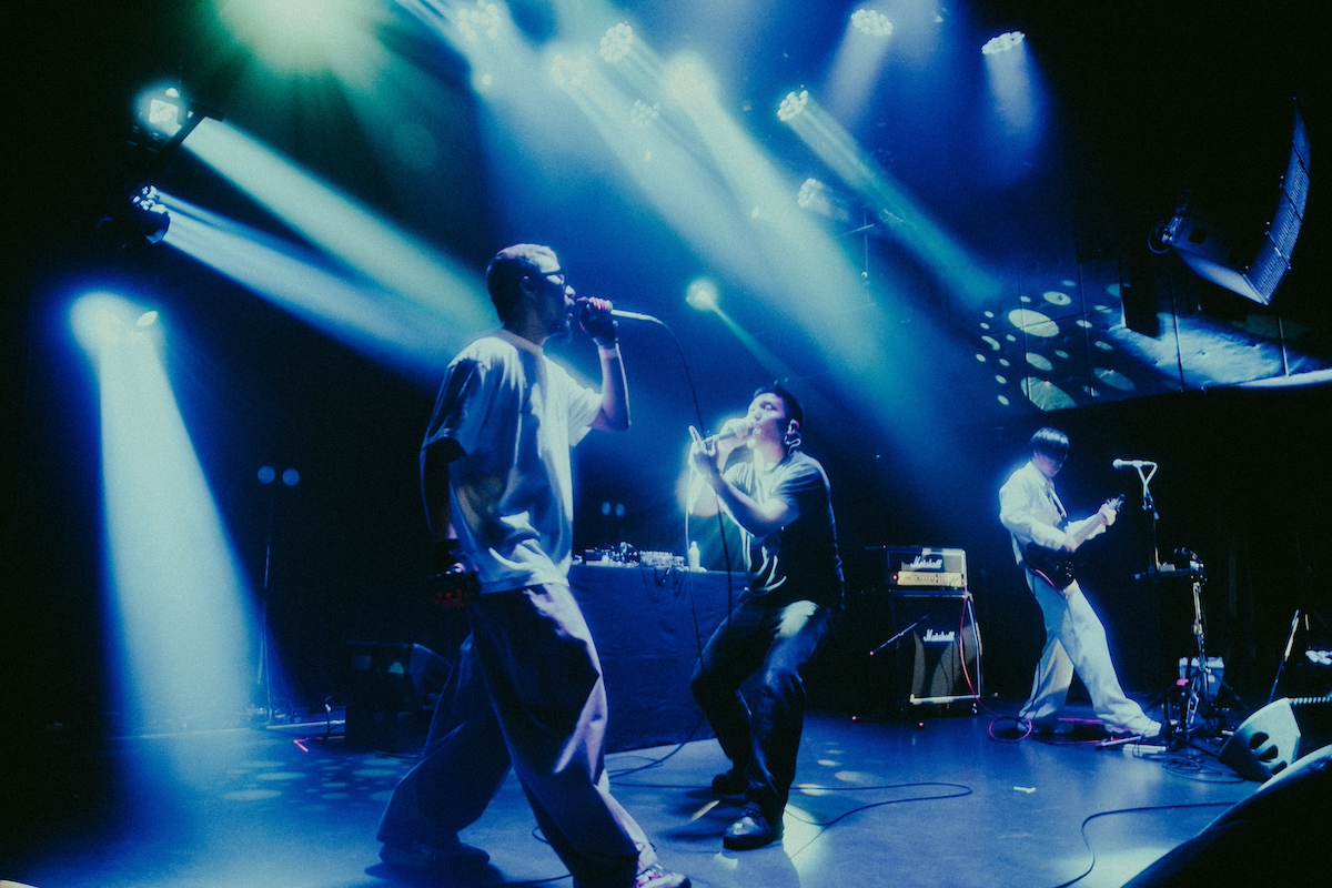 ギターを持った荘子itが語りかけるところからライブは始まる。ファンキーなリフが鳴り響き、後方では没 a.k.a NGSがサンプラーから強烈な重低音をぶっ放す。ギタリストと1 DJ、と書けないのは、2人とも演奏しながら激しくラップしているからだ。ことに、途中からセンターに飛び出す没はシャウトに近い大声でフロアに突っ込んでいくものだから、スタイルは限りなくハードコアのピンボーカルっぽい。さらに、長身でサングラス姿のTaiTanが悠々と登場し、めくるめく早口ラップで空気をさらっていったりするので、このグループを瞬時に○○系と決めるのは難しい。それぞれの個性がやたら際立っていること。3MCのヒップホップと呼ぶには妙にロック度が高いこと。まず伝わるのはそのあたりだ。