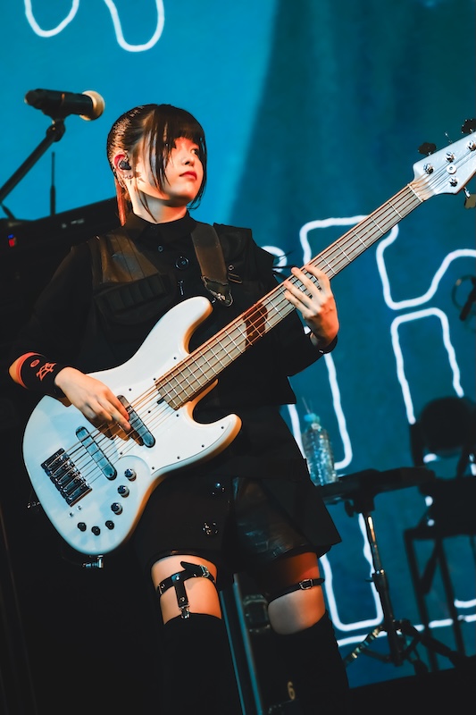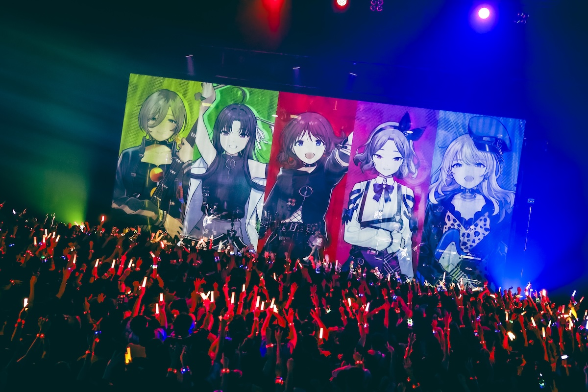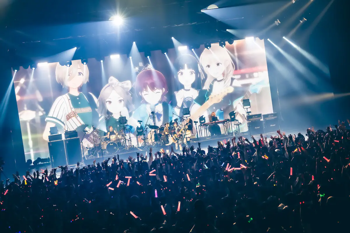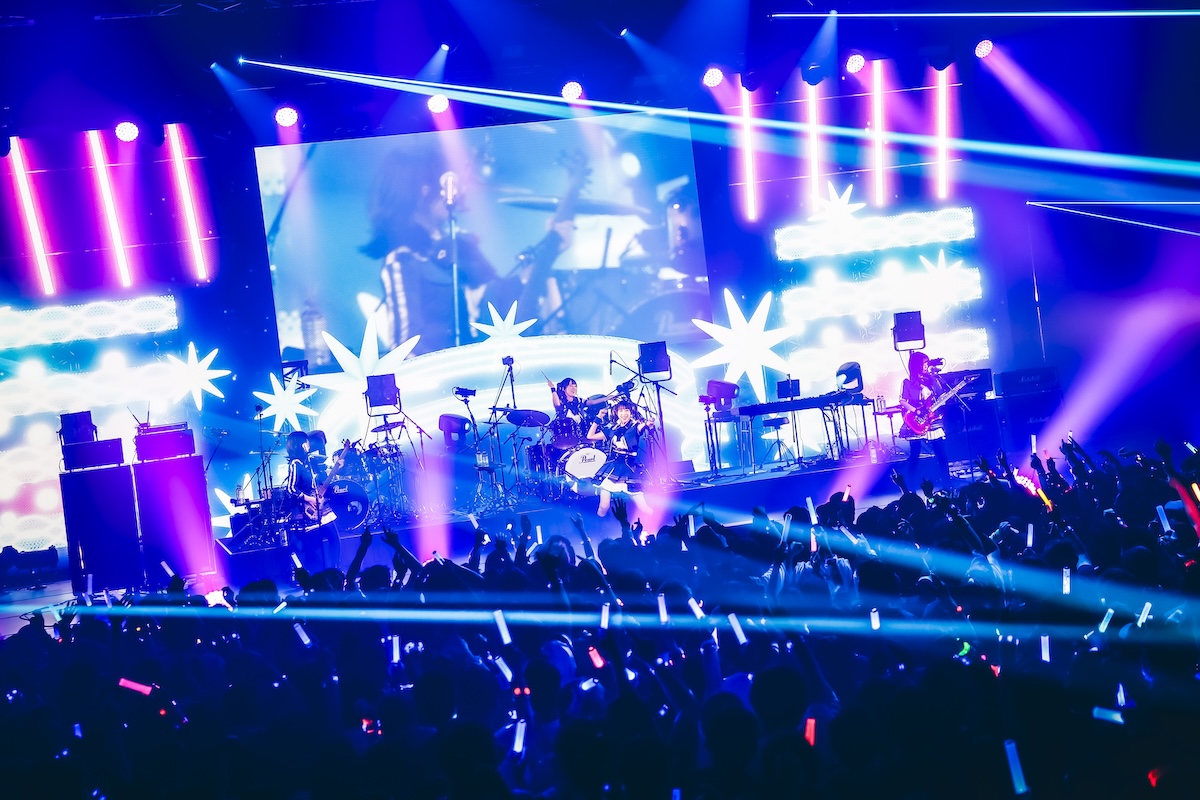定刻が過ぎた頃、会場が暗転するとスクリーンにはアニメの名場面を詰め込んだオープニングムービーが流れ出す。続いて、ステージにはトゲナシトゲアリの理名(Vo/井芹仁菜役)、夕莉(Gt/河原木桃香役)、朱李(Ba/ルパ役)が登場し、この日のライブが間違いなく“特別な夜”になることを告げる。そして、理名の合図とともにステージ前方に紗幕が下されると、サポートメンバー2名を迎えたトゲナシトゲアリは「雑踏、僕らの街」からライブをスタート。紗幕にアニメのオープニング映像が投影される演出と相まって、フロアのオーディエンスの熱気は一気に加速する。定期的にライブ活動を行なっていることもあってか、1年前の初披露から幾度となく演奏されてきた「雑踏、僕らの街」は極上のグルーヴ感を伴って観る者を圧倒。音源にはなかったハーモニーが追加されるなど、ライブを重ねる中で進化を遂げていることも伝わり、トゲナシトゲアリがアニメから生まれたバンドという枠を飛び越え、現在進行形のライブバンドとして日々成長し続けているのだと実感させられた。