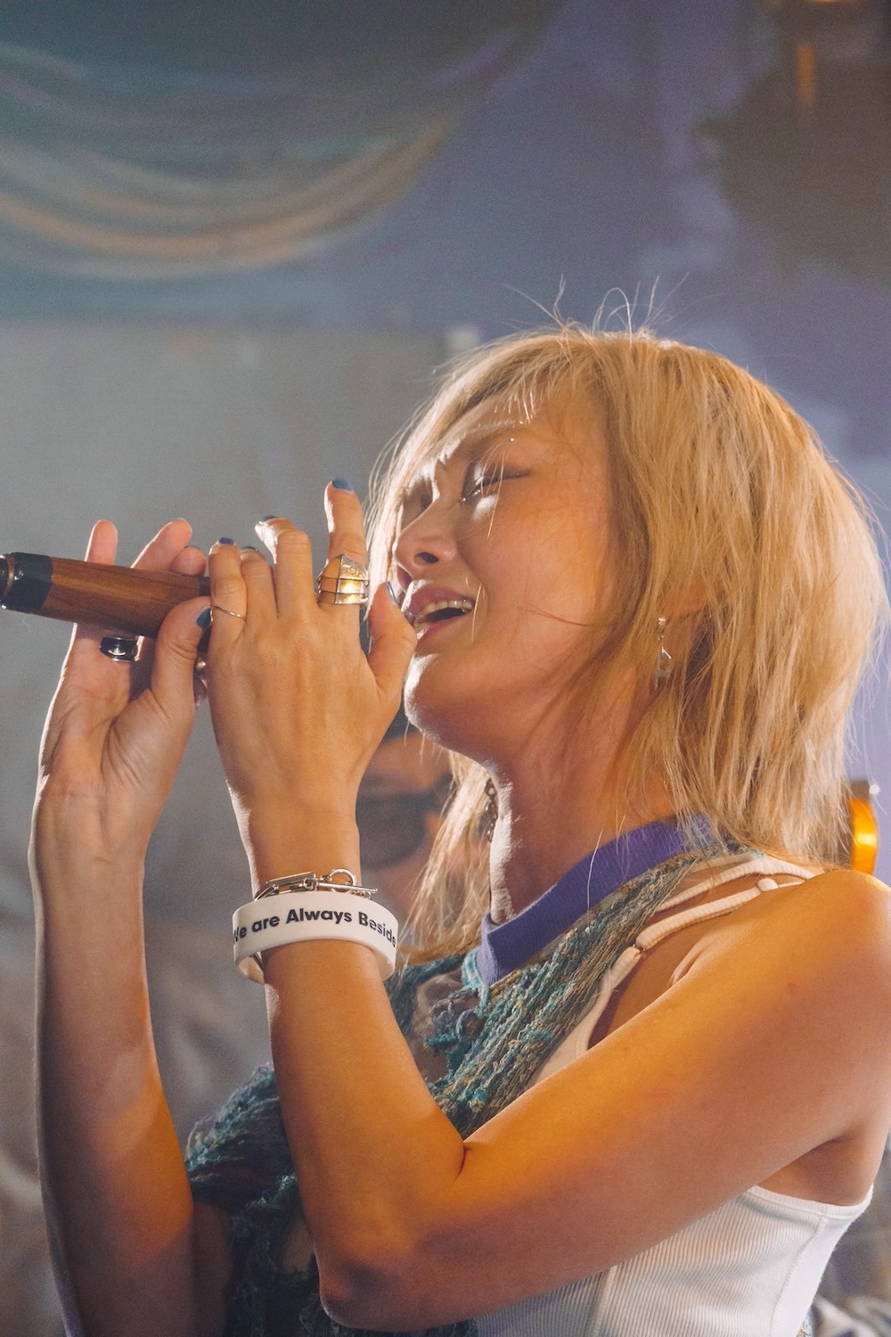 そして「もう一度高みを目指す」というポジティブな衝動が結実したラストナンバーが、「福島レッドホープス 2025 公式応援歌」でもある最新曲「BANG!」。歌詞においてもサウンドにおいても、これまで三上が歌ってきた楽曲の中で、最もシンプルなロックナンバーである。針の穴を通すように丁寧に言葉を紡いできた三上の歩みを思うと、オーディエンスを煽りつつ、〈BANG BANG BANG BANG 進め/DANG DANG DANG DANG 攻めろ〉とストレートなサビで突っ切っていく姿にとても感動した。重ねてきたキャリアやディスコグラフィが自然と自信になり、ここまで削ぎ落としても伝わるんだという確信が芽生えているのかもしれない。「SA -Samurai Anthem-」「Red Burn」「TRAJECTORY-キセキ-」……など、野球との縁で生まれた楽曲は絶えず三上のキャリアに新鮮な輝きを与えてきたが、「BANG!」はその先の未来を切り拓く、sayurasの新たな名刺になり得る1曲だ。