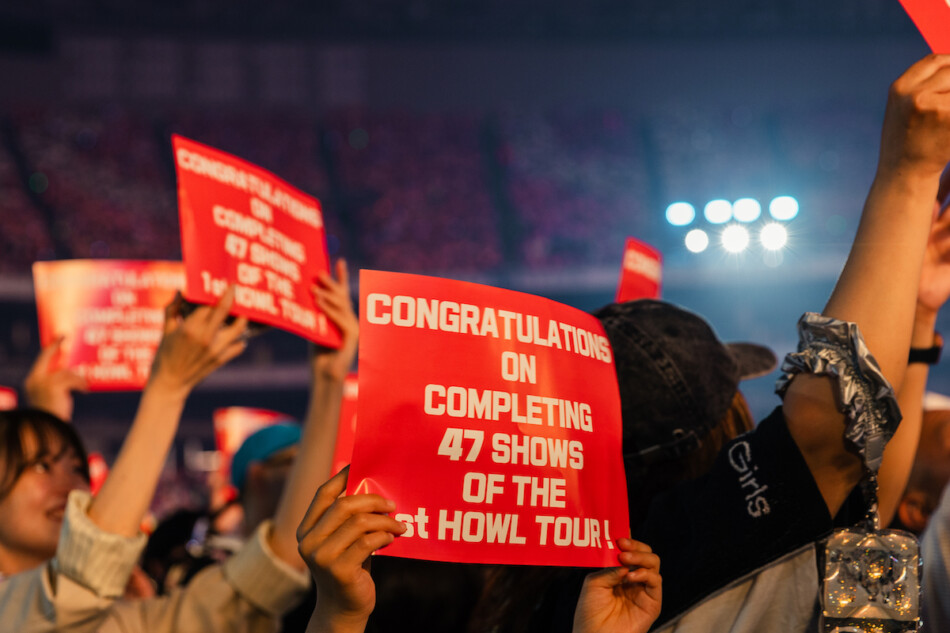 本編が終わった直後から、途切れないファンの歓声。それに応えるように始まったアンコールは、ツアータイトルとリンクした「狼が吠える映像」でスタートした。途中から狼が吠える姿と観客の声が共鳴し、不思議な空気に包まれていく。しばらくして、それぞれの魅力を引き出すカジュアルな衣装に身を包んだメンバーが「NEW DANCE」をパフォーマンス。楽しげな空気を作り出すと、本公演初のMCへ。