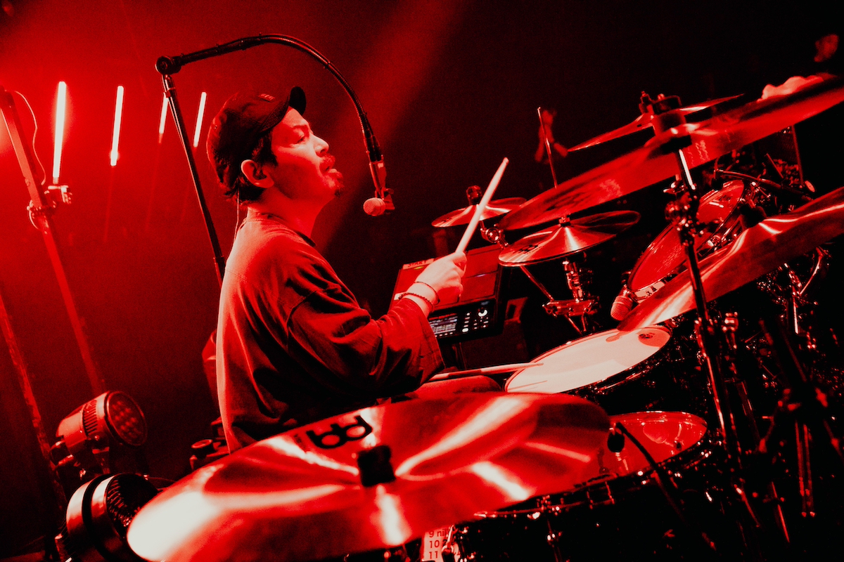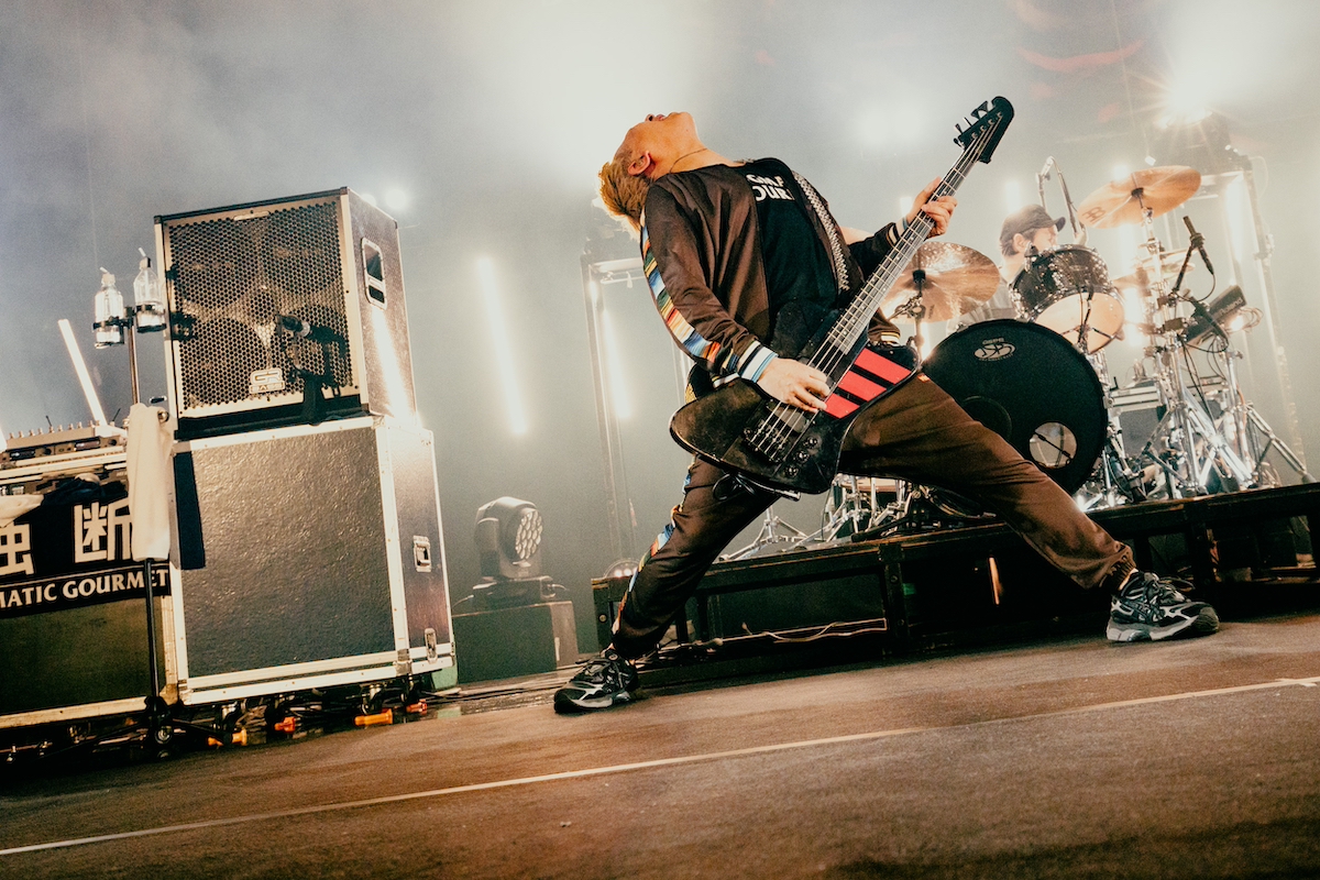 「火とリズム」から幕を開けたこの日。あの空を割くようなギターイントロとどっしりしたリズム隊が象徴するように、疾走感だけでなく“重さ”でしっかり聴かせていくのが、まず今回のモードだったように思う。早くも2曲目に「VIBES BY VIBES」を、その後も「1sec.」や「STONE COLD BREAK」などグルーヴでグイグイ引っ張っていくミクスチャーアンセムを間髪入れずに叩き込む。とりわけ、シーケンスやブレイクビーツを大胆に交えた「ハローフィクサー」、そしてそのスタイルを昇華させた「gg燦然」への流れには、DJの繋ぎのような没入感があった。だが、それを“外しの変化球”としてではなく、あくまで“真っ向勝負のストレート”として放っていたことに、ミクスチャーバンドとしての新鮮かつピュアな側面が増強されているのではないかと感じた。