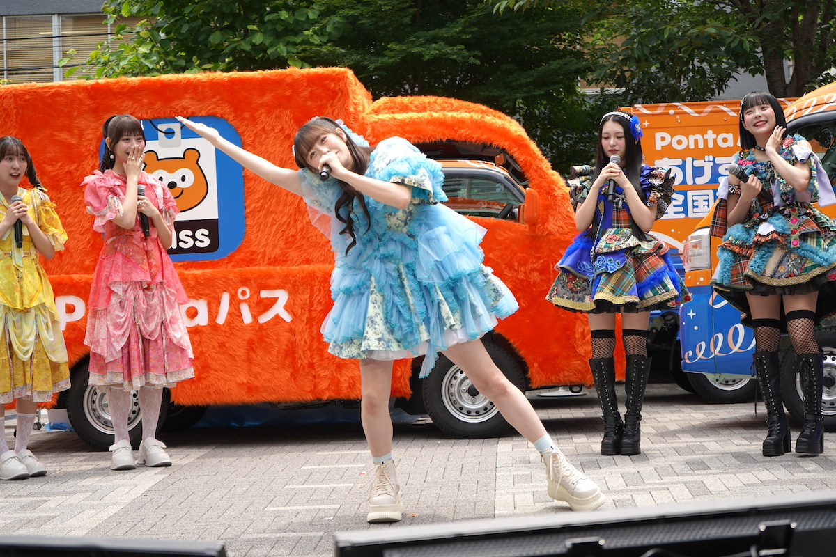 ここで、Pontaパス公式コンシェルジュに就任した白石を応援すべく、各グループのメンバーが短いパフォーマンスを行った。今回は鎮西が審判を務め、応援力の高いパフォーマンスを行ったメンバーを「優勝者」として決定するという。トップバッターを務めたFRUITS ZIPPERの真中は、鎮西の持ちネタを披露。「ABCDいい角度、からの、ABCDEFじーっ」と歌うと、白石を至近距離で見つめ、会場内に笑いを巻き起こした。