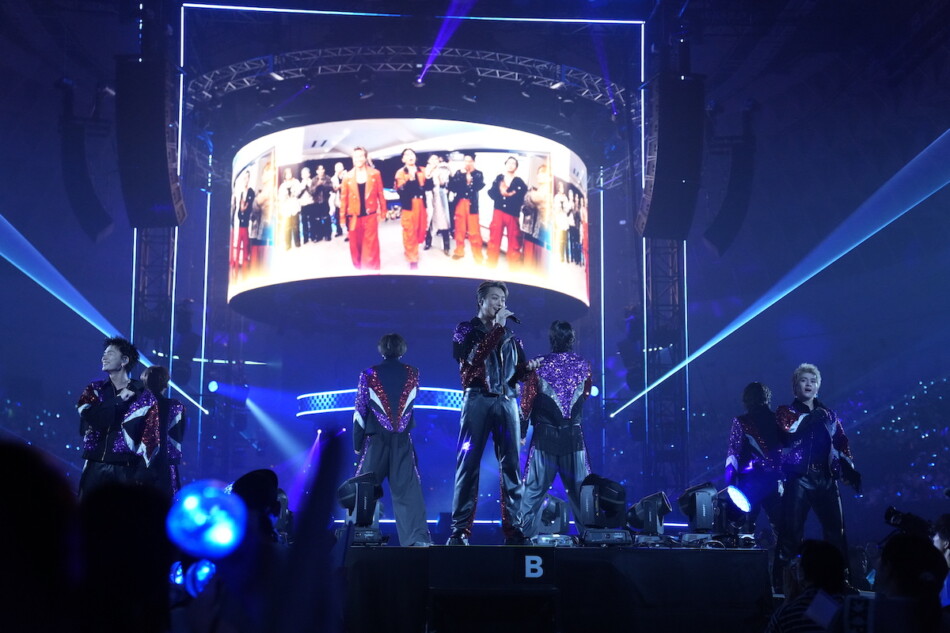 再びステージにTAKAHIRO・NESMITH・SHOKICHIの3ボーカルが現れると、早くも後半戦がスタート。出演者全員で「ALL NIGHT LONG」を歌い踊り、ラストに向けて加速していく。SHOKICHIが「みなさんの“願いの矢”を空高く飛ばしましょう!」と言い添えた「BOW & ARROWS」は、EXILEデビュー20周年を記念した企画『EXILE TRIBUTE』でTHE RAMPAGEがカバーしたキャッチーなアップチューンである。メンバーたちは歌いながら客席内を練り歩き、「E!X!I!L!E!」のコール&レスポンスで会場を1つに。ライブ定番曲「WON’T BE LONG」には、BALLISTIK BOYZの面々もボーカルやラップで新たな色を加えた。その一方、“WHAT IS EXILE”という新たな挑戦への前向きなメッセージを乗せた「EXIT」は、あえてEXILEに所属するメンバー7人のみで想いを伝える。NESMITHが「みなさん、EXILE歌ってますかー!?」と呼びかけ、シングル『EXIT』のカップリング曲「DIAMOND」へ。ATSUSHIが作詞を手掛けた「Pure」では、1つ1つの歌詞を宝物のように歌いながら、「10年後もみなさんとこうして、一緒に過ごしていますように……」と語り掛けるTAKAHIROに大きな拍手が贈られた。