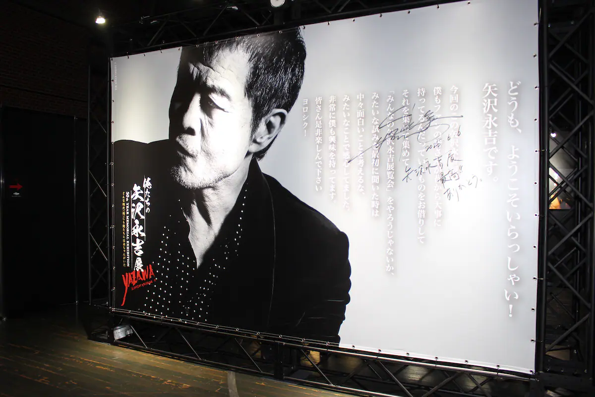 会場に入ると、「どうも、ようこそいらっしゃい! 矢沢永吉です。」と巨大なウェルカムボードがお出迎え。6月6日午前中に矢沢本人が会場に訪れたそうで、「矢沢永吉展最高!!ありがとう。」とサインが入っていた。同じフロアにあるのは、日本武道館公演での楽屋を再現したセットだ。