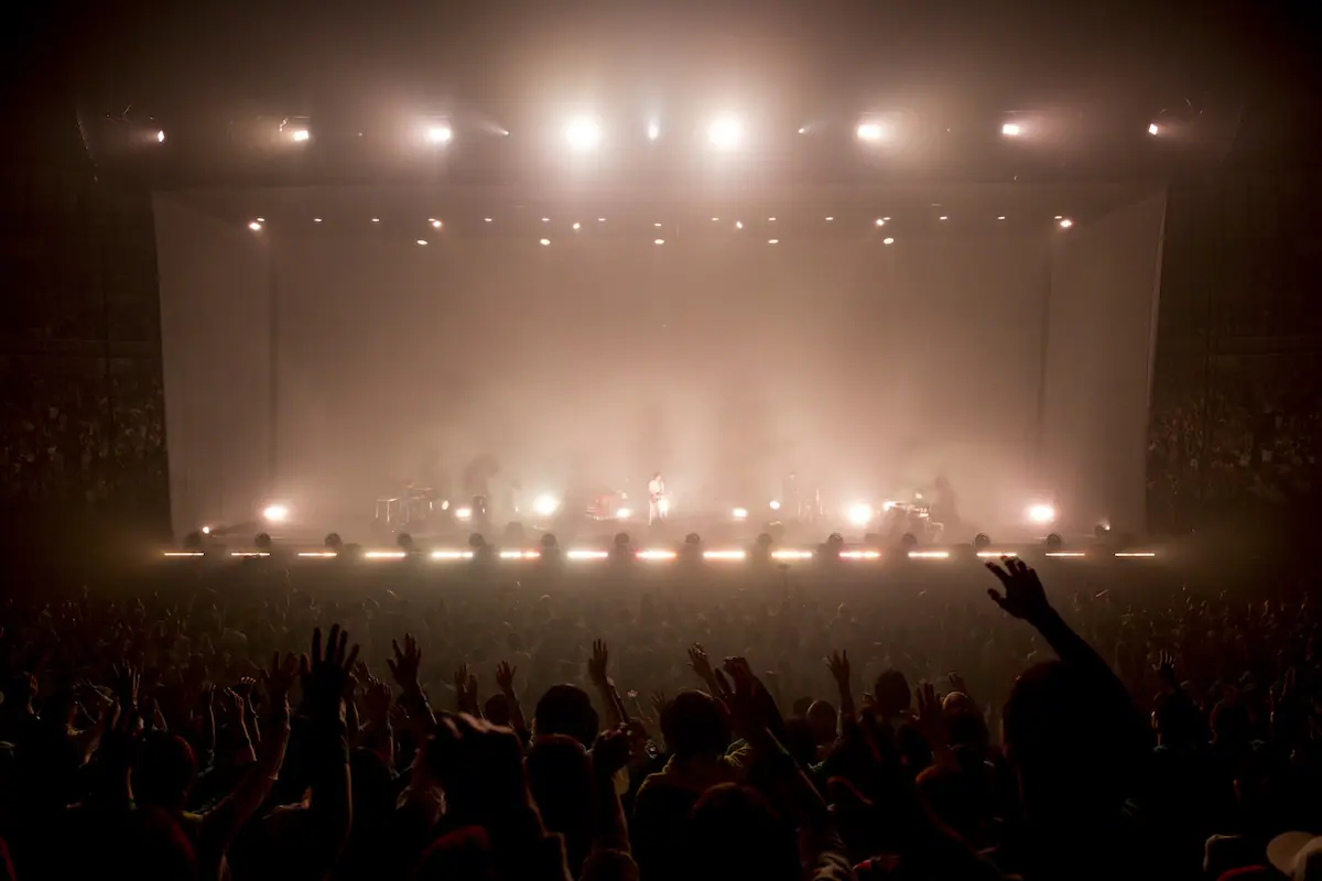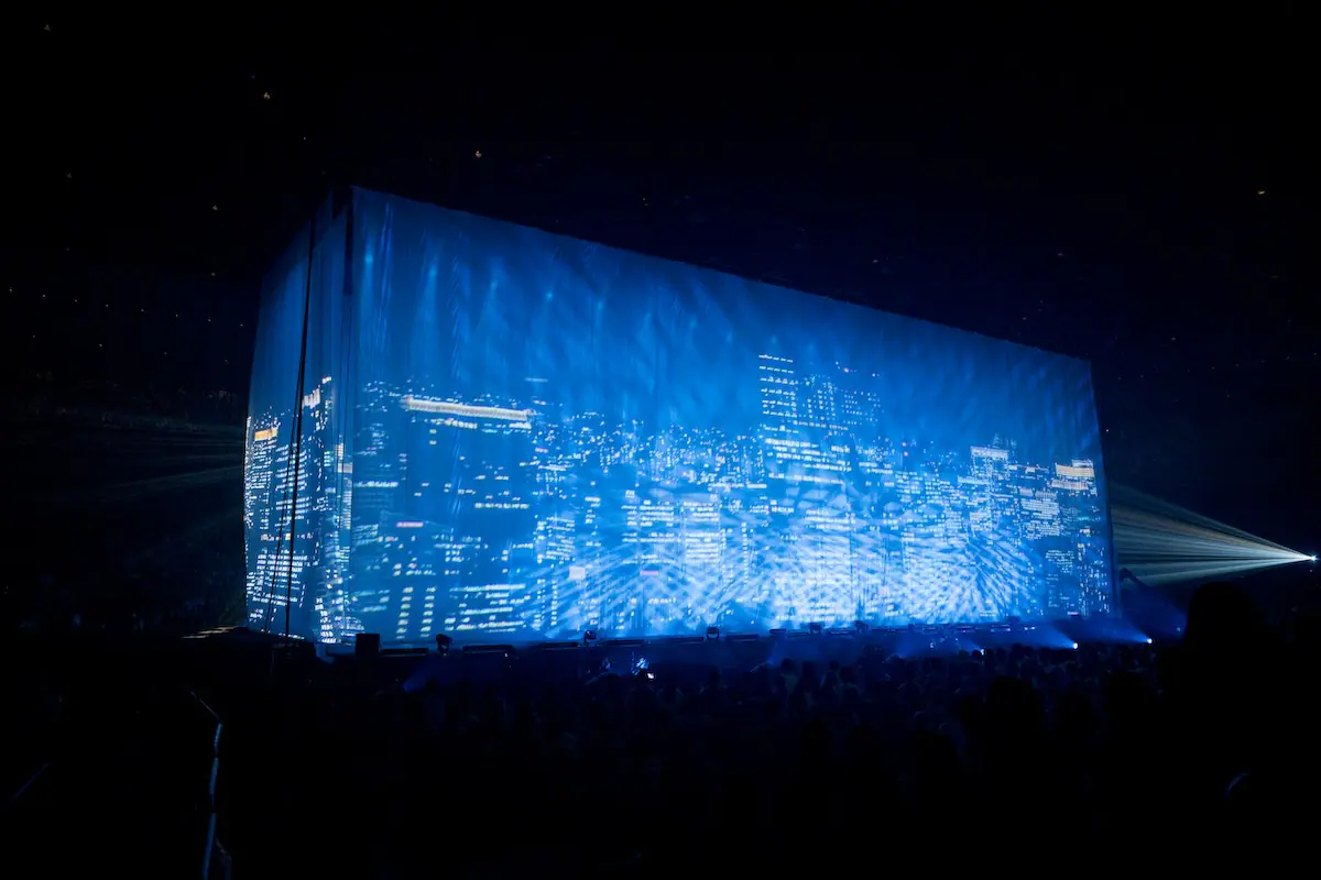 喜多朗:まず初めに、シャワーカーテンがモチーフとして浮かびました。御供、奉仕、貧窮の象徴。それが横浜アリーナの中央で揺らいでいたらどんなに美しいだろうかと思いました。また、横浜アリーナはすり鉢状で多くのお客さんから見下ろされる事になる。僕は以前からライブは奇怪な生き物の観察のようだと捉えていたし、僕自身のライブについてそういった意見も貰っていたので、よりお客さんを食い入るように見つめさせたいと思いました。結果として四方をカーテンで覆う事で観客との距離感を調節する事にしました。次第に近づき高揚感を煽る事で「ただそこにいる」という事の価値を高める事に成功したと思います。