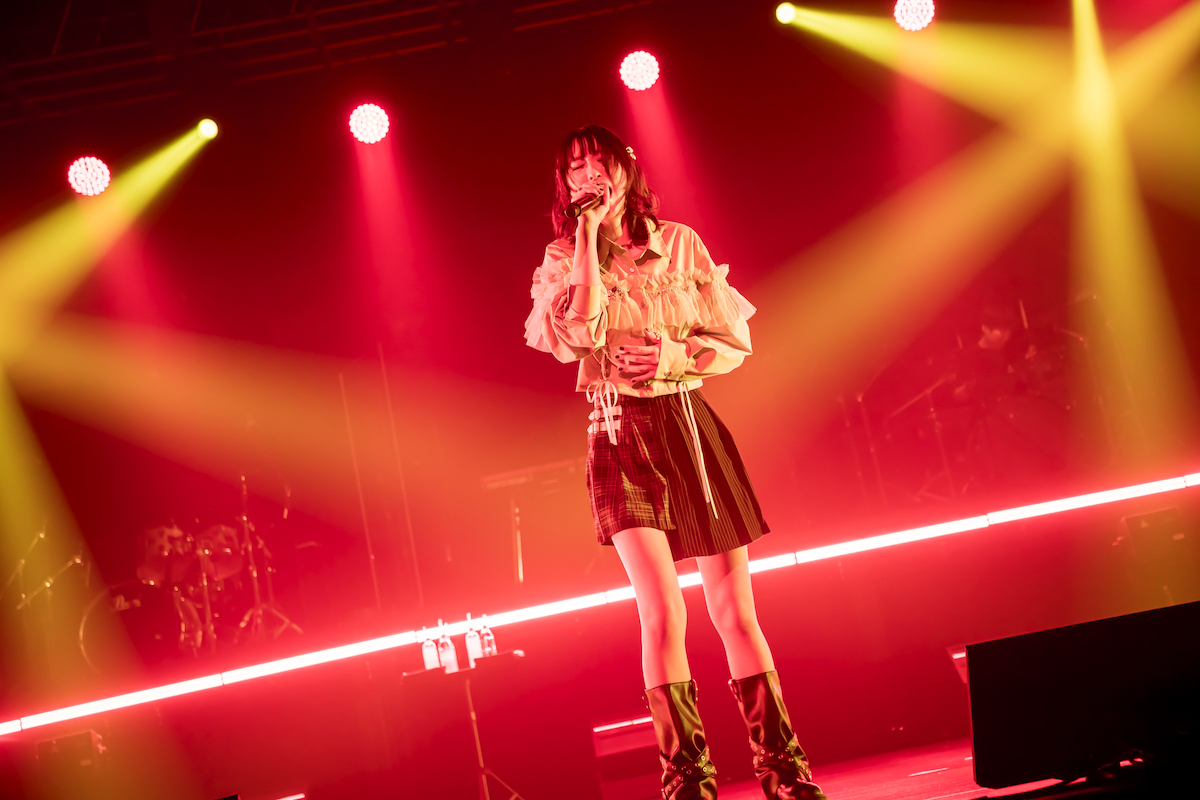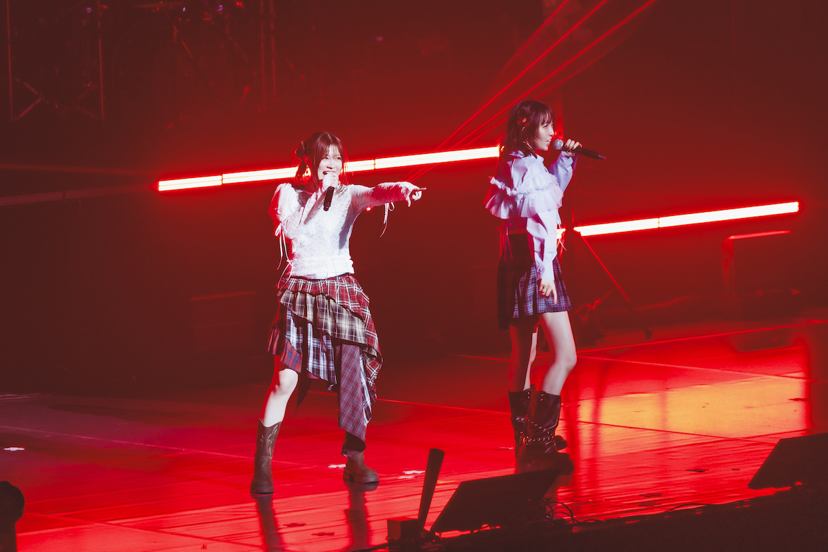 2組を紹介するオープニングムービーに続いて、会場が真っ赤な照明で染め上げられると、荘厳なSEに続いて紗幕のかかったステージに2人のシルエットが浮かび上がる。そして、流麗なピアノイントロに続いてバンド演奏が始まると同時に幕が降りると、バンドメンバーを従えたXAIと鈴木このみが姿を現し、ドラマチックな「春眠旅団」にてライブはスタート。ヘヴィかつダイナミックなバンドサウンドに乗せて、随所にスクリームを織り交ぜながら2人の芯の通った歌声を交互に響かせていく。その温かみの強い声は時に美しいハーモニーを奏で、時にはユニゾンで歌うことでパワフルさを増していく。魂と魂のぶつかり合いのようなステージは、シーレジェという唯一無二の存在を端的に表すにぴったりな内容だ。