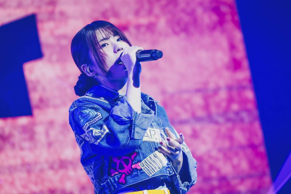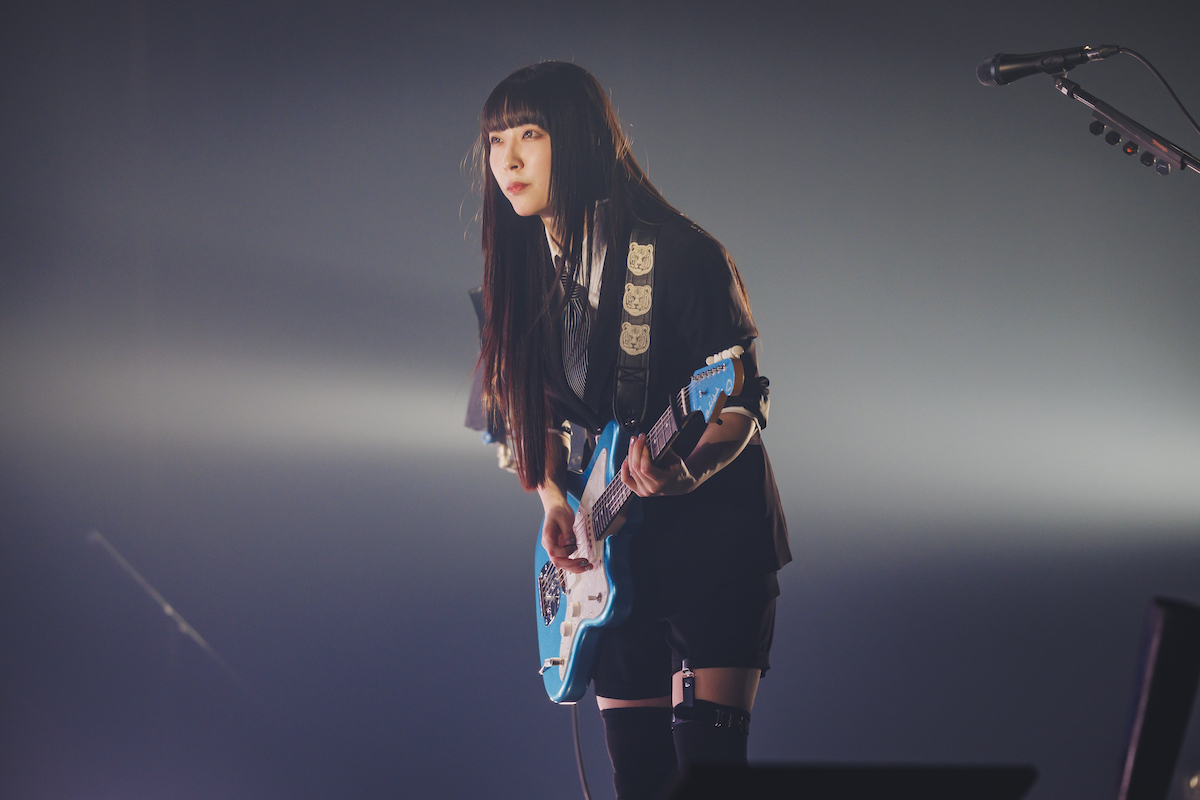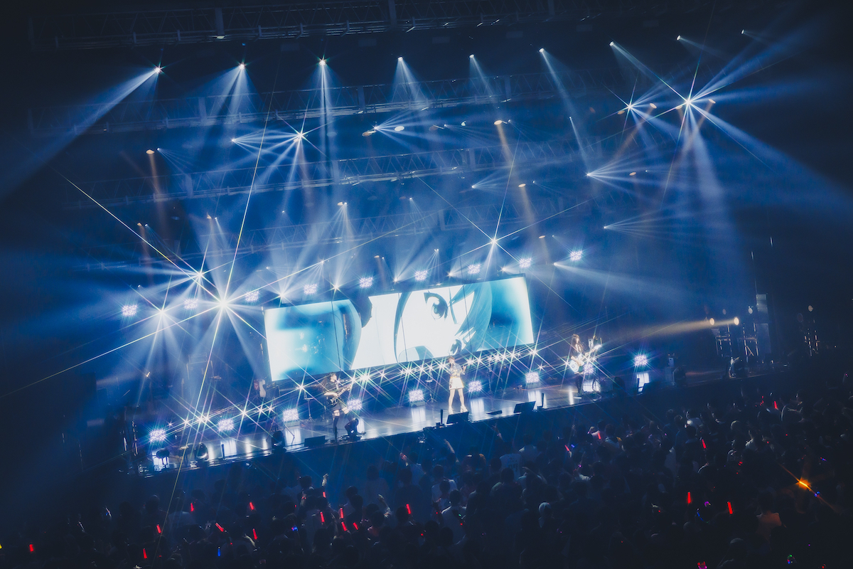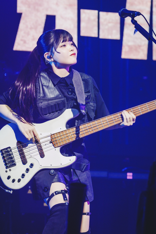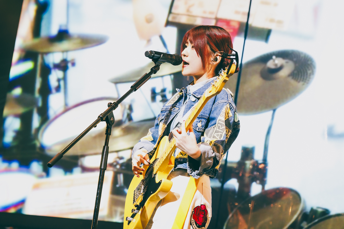 中でも特に会場が沸いたのが、TVアニメ『ガールズバンドクライ』オープニング主題歌「雑踏、僕らの街」がコールされた瞬間だろう。シーレジェの好演に刺激されたのだろうか、アニメのオープニング映像を背に歌う理名はいつも以上に熱のこもった歌声を、大会場の隅々にまで届けていく。一方、夕莉(Gt/河原木桃香役)はクールさを見せながらも、時には笑顔を浮かべて豪快さと繊細さを併せ持つギタープレイで観客を夢中にさせる。その佇まいやステージングは、ライブを重ねるごとに存在感を高めており、とてもステージデビュー2年に満たない人間のそれとは思えないほど。それは朱李も同様で、サポートメンバーの叩き出すビートに乗せて堅実でグルーヴィーなベースラインを重ねながら、時にコーラスワークで、時には絵になるステージングで観る者の目を惹きつける。特にこの半年ほどの3人の成長速度は急激なものがあり、ここから9月に予定されている初の日本武道館公演『奏檄の叫』までにどこまで進化するのかも気になるところだ。