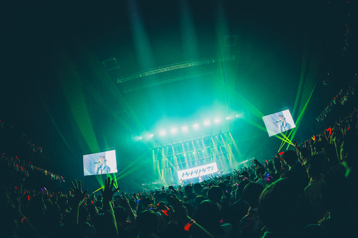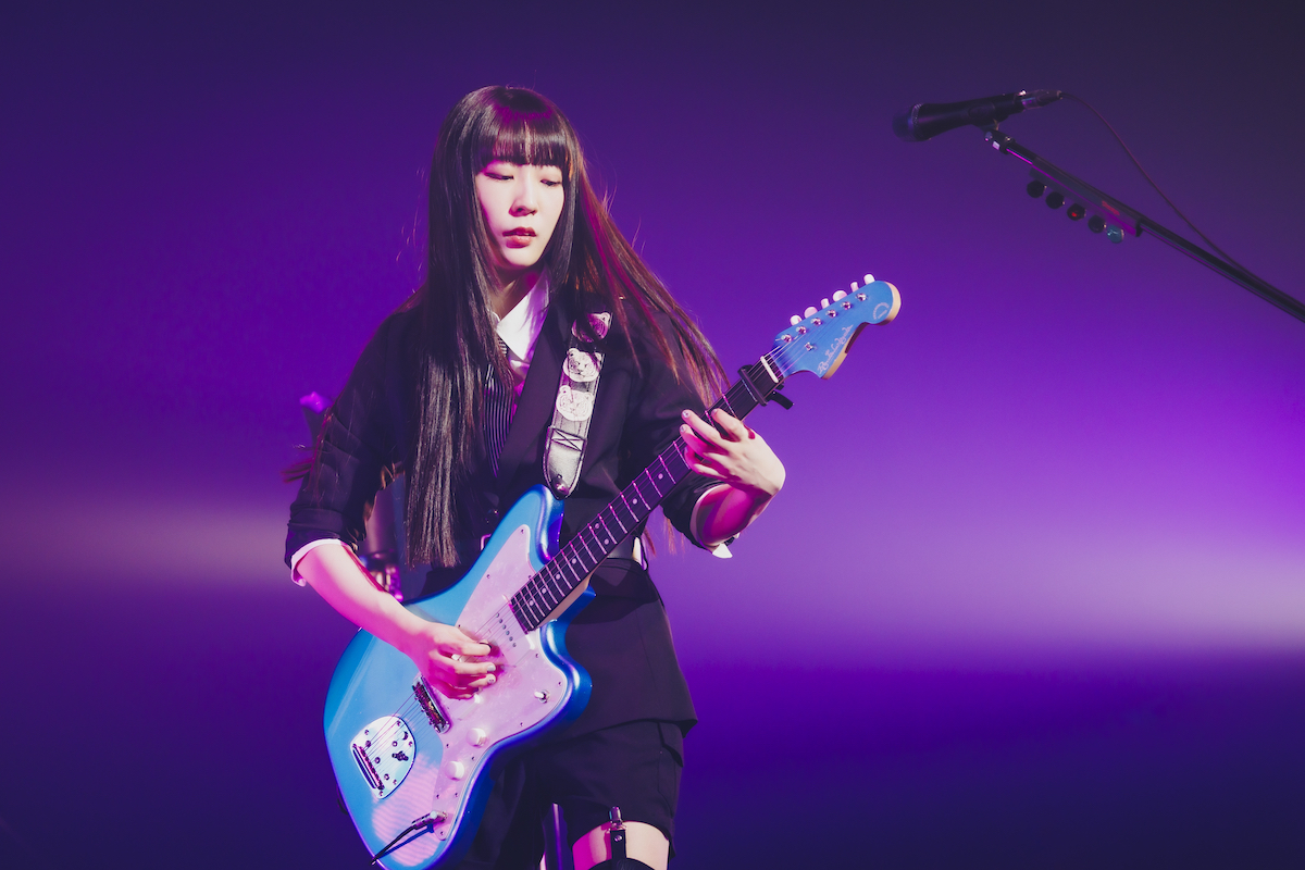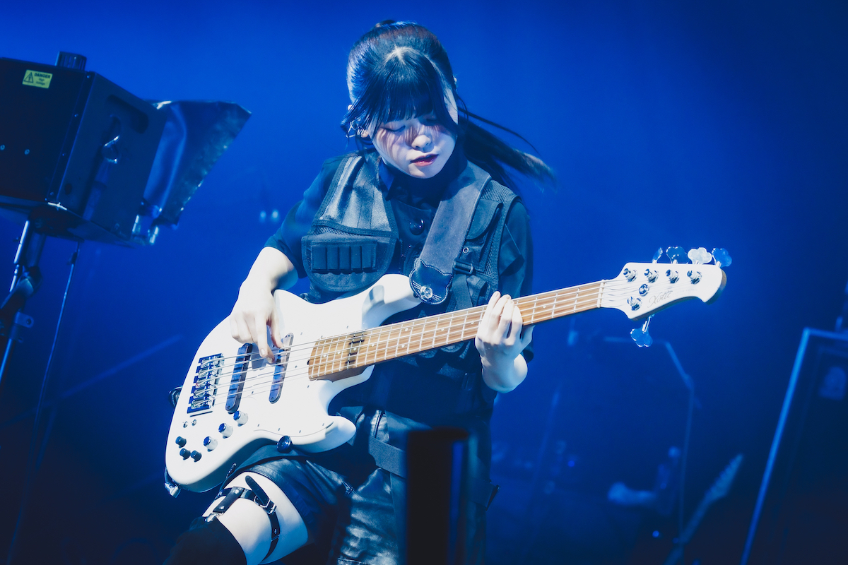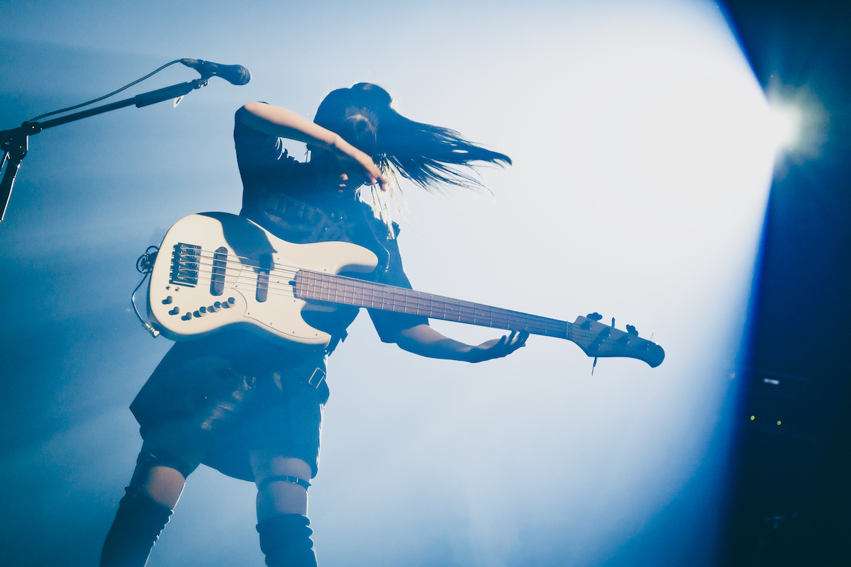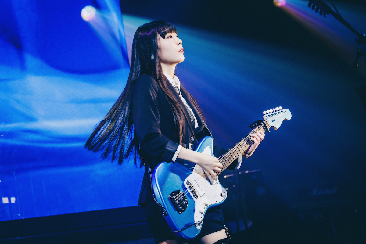 中でも特に会場が沸いたのが、TVアニメ『ガールズバンドクライ』オープニング主題歌「雑踏、僕らの街」がコールされた瞬間だろう。シーレジェの好演に刺激されたのだろうか、アニメのオープニング映像を背に歌う理名はいつも以上に熱のこもった歌声を、大会場の隅々にまで届けていく。一方、夕莉(Gt/河原木桃香役)はクールさを見せながらも、時には笑顔を浮かべて豪快さと繊細さを併せ持つギタープレイで観客を夢中にさせる。その佇まいやステージングは、ライブを重ねるごとに存在感を高めており、とてもステージデビュー2年に満たない人間のそれとは思えないほど。それは朱李も同様で、サポートメンバーの叩き出すビートに乗せて堅実でグルーヴィーなベースラインを重ねながら、時にコーラスワークで、時には絵になるステージングで観る者の目を惹きつける。特にこの半年ほどの3人の成長速度は急激なものがあり、ここから9月に予定されている初の日本武道館公演『奏檄の叫』までにどこまで進化するのかも気になるところだ。