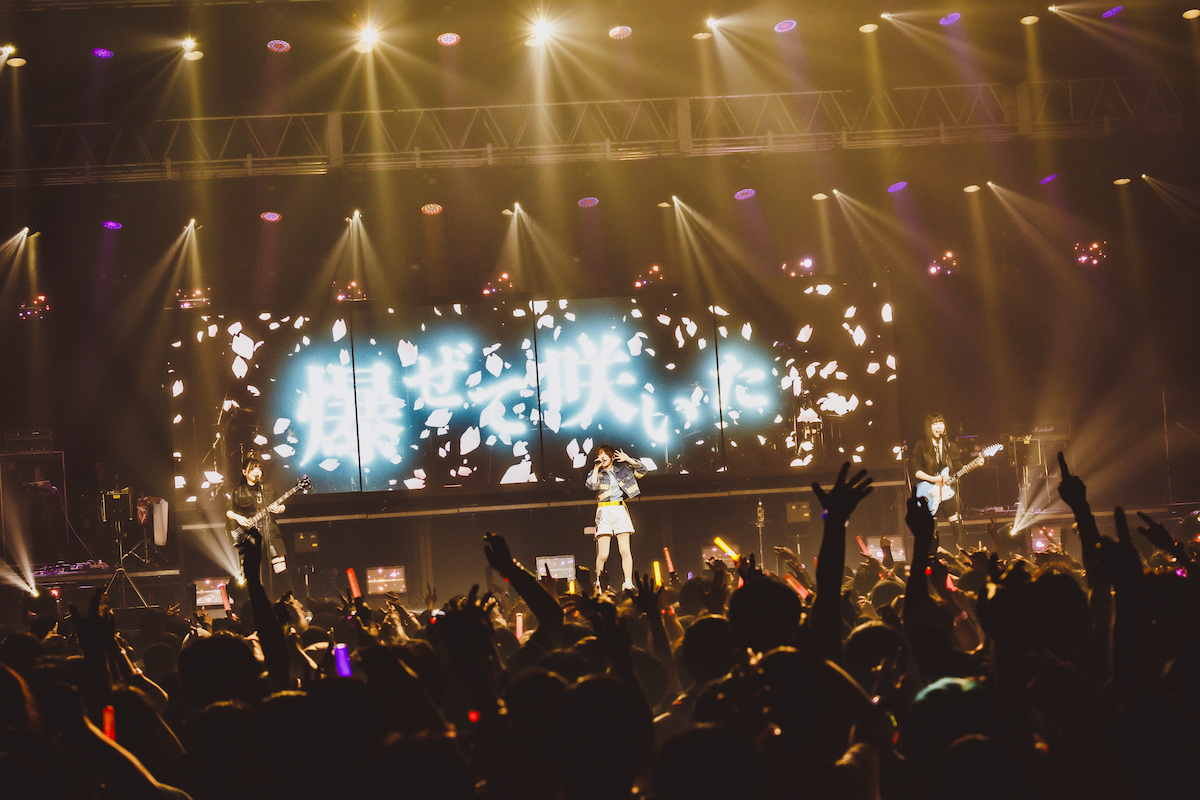 短いインターバルで始まったトゲトゲのステージは、冒頭の理名(Vo/井芹仁菜役)による〈スベテコワシタイ〉のセリフが印象的な「渇く、憂う」で幕を開けると、続く「闇に溶けてく」からは早くもギア全開。その後のMCで理名が「50分ちょいで14曲!」と宣言すると、早くも登場した「運命の華」を筆頭に、怒涛のステージが展開されていく。テレビアニメ『ガールズバンドクライ』で使用された楽曲では、メンバーの後方に用意された長方形のLEDスクリーンにアニメの名場面や関連した映像が映し出され、会場のファンを大いに喜ばせる。その後も、「運命の華」に続いて理名がギターを掻き鳴らす「声なき魚」、曲冒頭で朱李(Ba/ルパ役)の豪快なベースソロがフィーチャーされた「空白とカタルシス」と人気曲の数々が繰り出され、そのたびに客席からの歓声はどんどん大きくなっていった。
