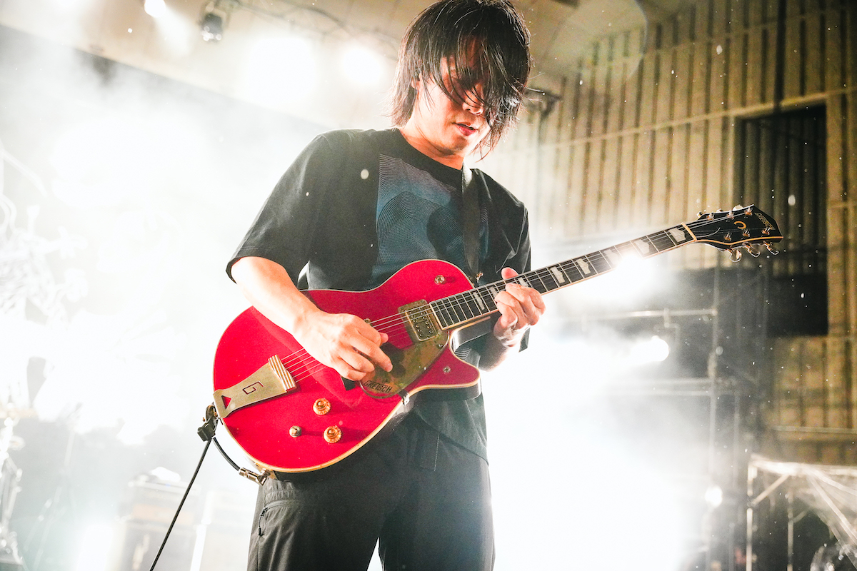 エスニックなセッション風のイントロで始まった「幻日」から、岡峰のベースと菅波のギターがせめぎ合う「情景泥棒」でスリリングな空気を高め、山田も歌いながらギターを弾いてライブならではのバンドの音が響き渡る。さらにこの曲のスピンオフ「情景泥棒〜時空オデッセイ〜」へ。バックトラックに乗せて山田が呟く原曲と対照的な前半からスリリングな後半へと、曲の情景を変えて行く中で菅波のギターソロが熱っぽく光った。その熱のままに「カラビンカ」が続き、山田の力強い歌と菅波のギターに合わせてオーディエンスが腕を上げる。カラビンカ(迦陵頻伽)とは仏教用語で美しい声を持つ人頭鳥身の生き物を表すからだろう、エンディングで菅波はギターを置いて両腕を鳥のように羽ばたかせてステージを飛び回った。