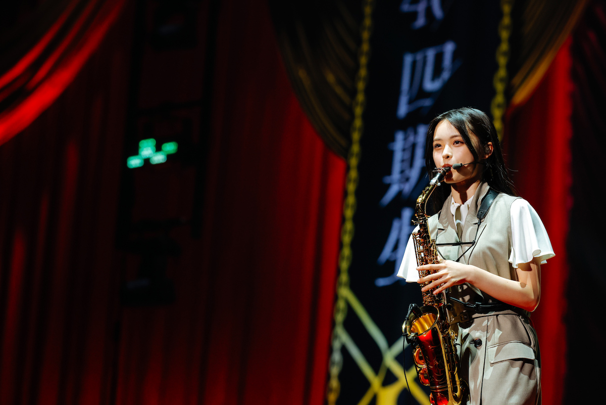 浅井がアドリブを効かせた「On my way」のサックス演奏でトップバッターを務めると、続く稲熊は凛とした表情でリズム薙刀を披露。勝又は自身の名前にちなんでか、「ずっと 春だったらなあ」をアコースティックギターで弾き語りし、佐藤は前述のバイオリン演奏(「桜月」を優雅に披露)に加えて四期生のスローガンのひとつである“圧倒”を書道で書き上げる。