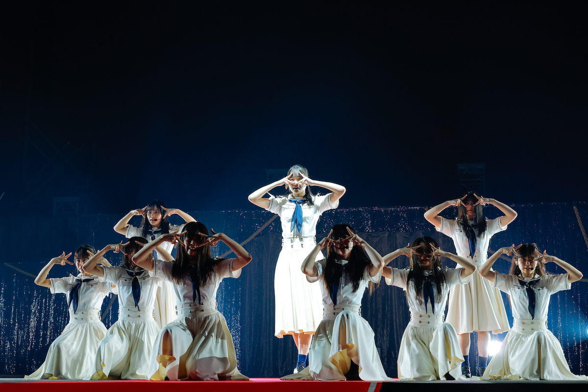 その一方で、続く「ドローン旋回中」では笑顔を振り撒きながら、タオル片手に全身を使ってBuddiesにアピール。曲中、センターの山川が「Buddiesの皆さん、声出せますか? いくぞ!」と煽る場面もあり、この対照的な2曲で早くもオーディエンスはノックアウトされたようだった。