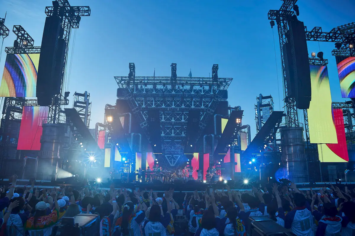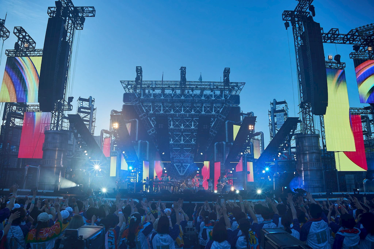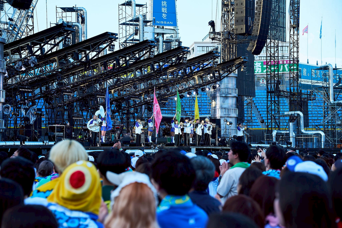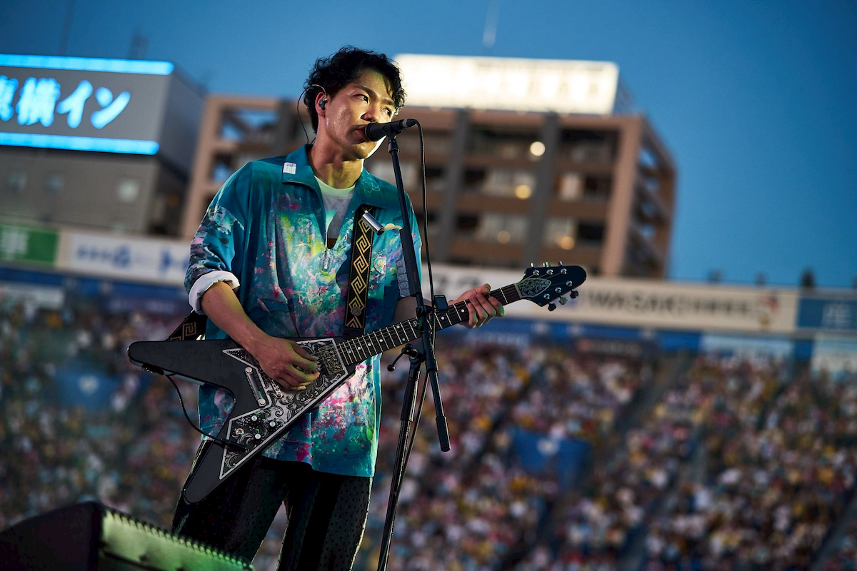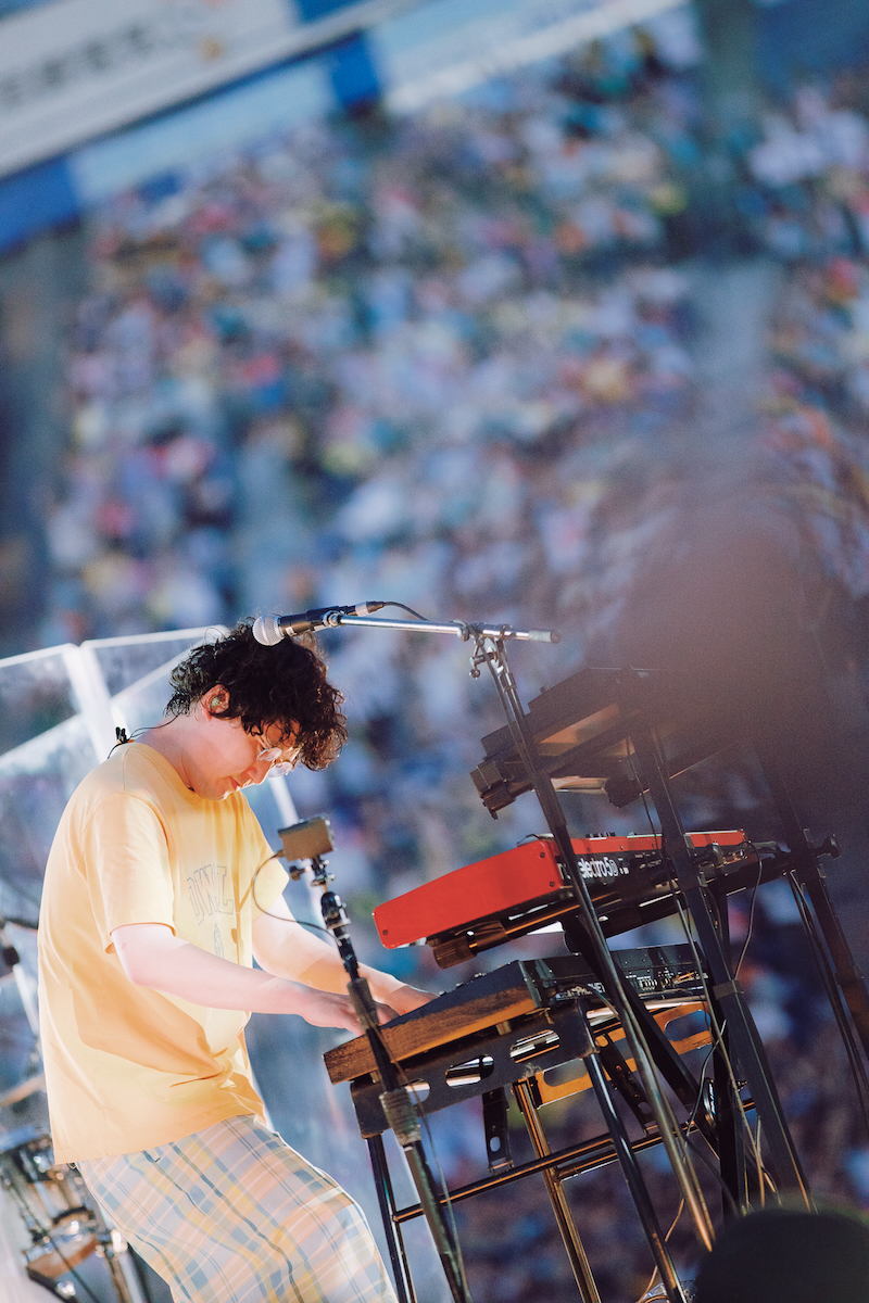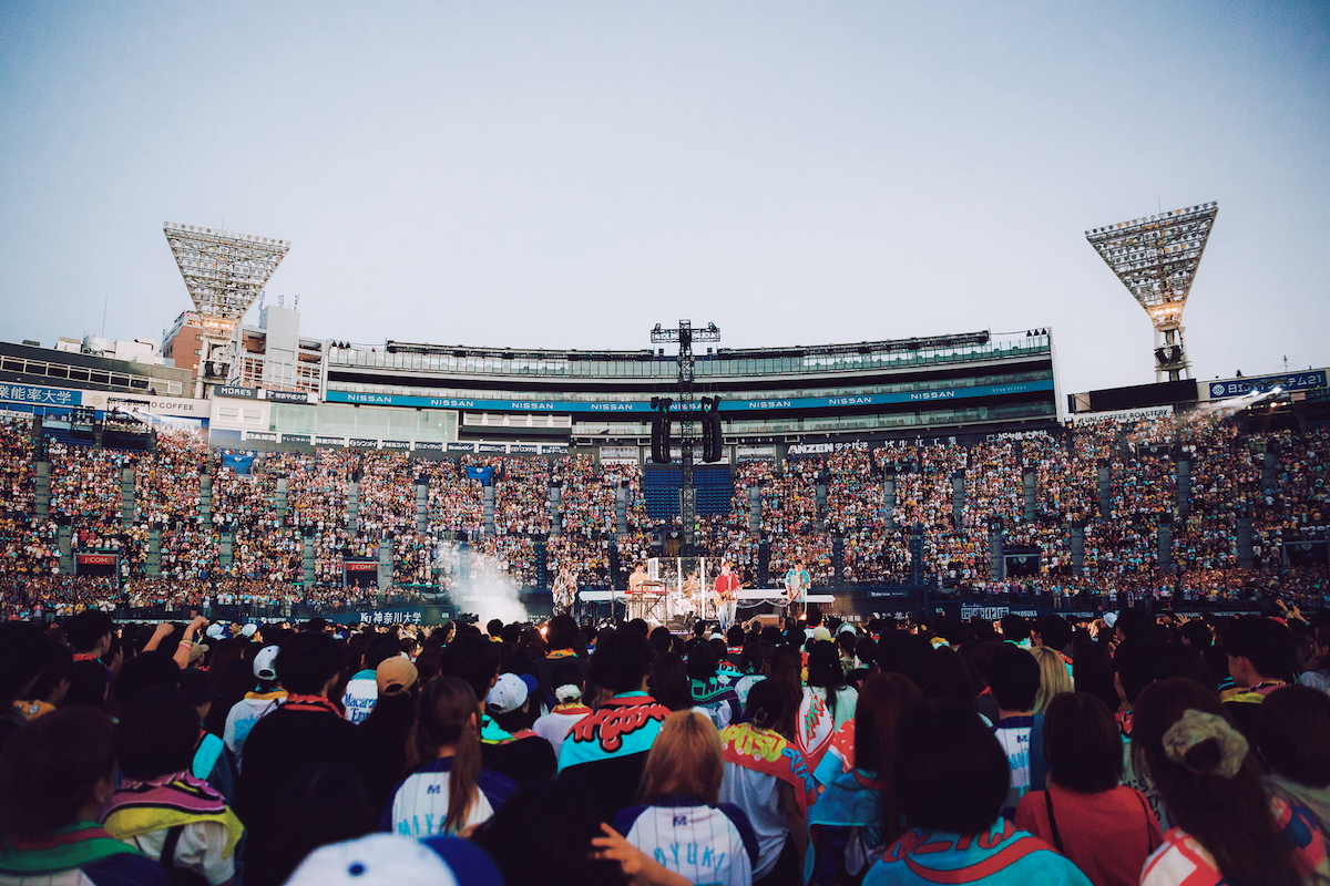 ハマスタという会場ならではの演出で場を温めると、はっとりの「ハマスターっ!」を合図に「トリコになれ」からライブはスタート。バンドが生み出す極上のグルーヴとブラスセクションを迎えたスペシャル編成による華やかなサウンドが響き渡ると、会場は早くも幸福感に包まれていく。続くアップチューン「鳴らせ」でギアが一段高く入ると、客席のテンションも急上昇。はっとりの伸びやかな歌声が青空に響き渡る中、高野や田辺はステージ両サイドに散って大会場でのステージを満喫していく。その後も長谷川が奏でる軽快なピアノにオーディエンスのシンガロングが重なる「レモンパイ」や、〈待っていたんだ〉というフレーズにちなんで客席に「待ってた?」と問いかける「洗濯機と君とラヂオ」と、バンドの基盤を作り上げた楽曲群の連発で会場の一体感はどんどん高まっていった。
