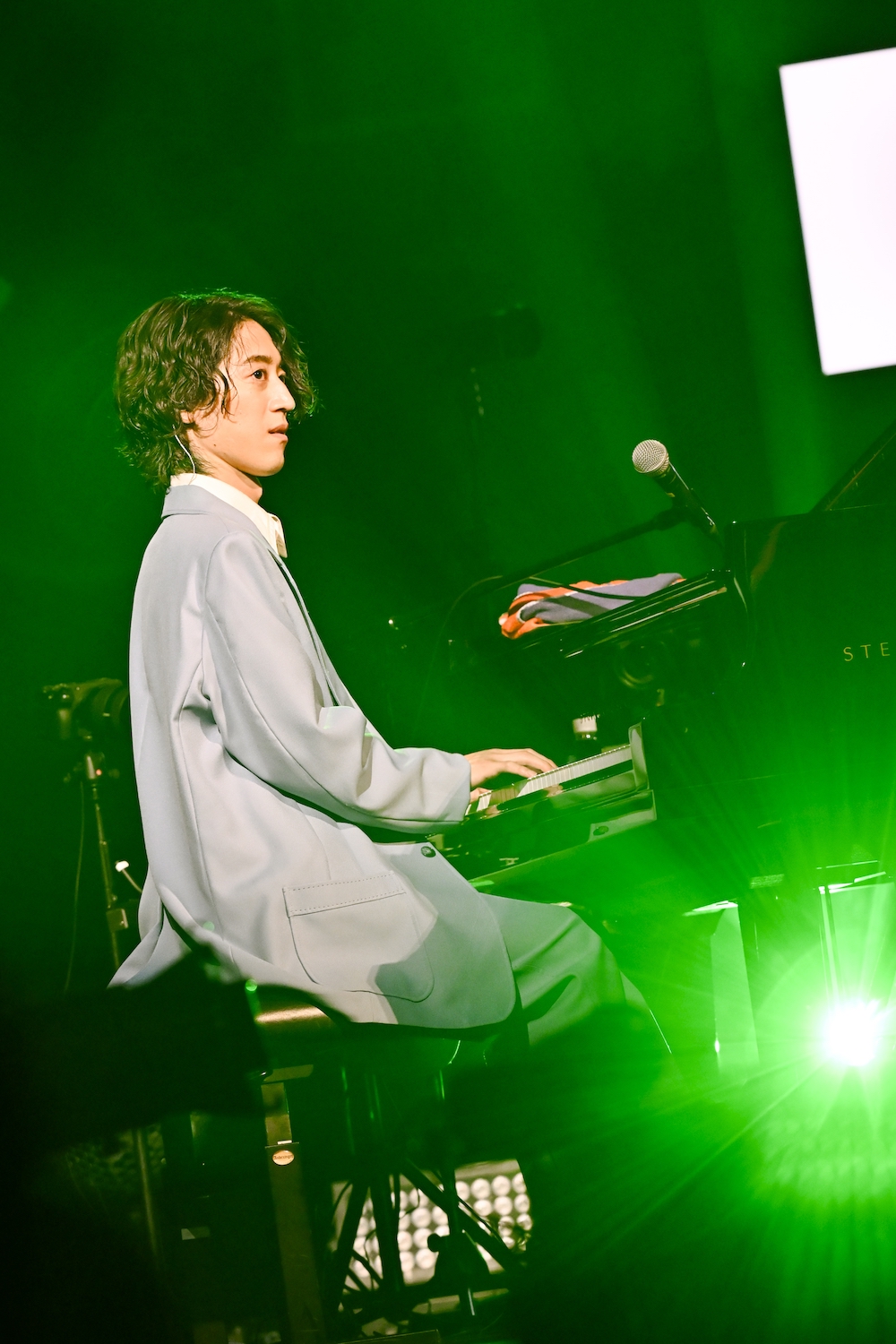 中盤、恒例のカバー曲コーナー。Cateenがグランドピアノの前でスタンバイする。ミュージカル部出身の大島が選んだのは映画『ウィキッド ふたりの魔女』から、エルファバ役のシンシア・エリヴォがミシェル・ヨーと歌った「The Wizard And I」。大島曰く「(ミュージカル部で)緑の魔女の役をどうしてもやりたくて。勝ち取った」という思い入れのある1曲だ。発音も変え、ミュージカル然としたアプローチで聴かせる大島。伸びやかな歌声に聴き入っていたが、驚いたのはラストの声量。ボリューム最大をこの瞬間までとっておいたのかと思わせる見事なボーカルで魅せた。