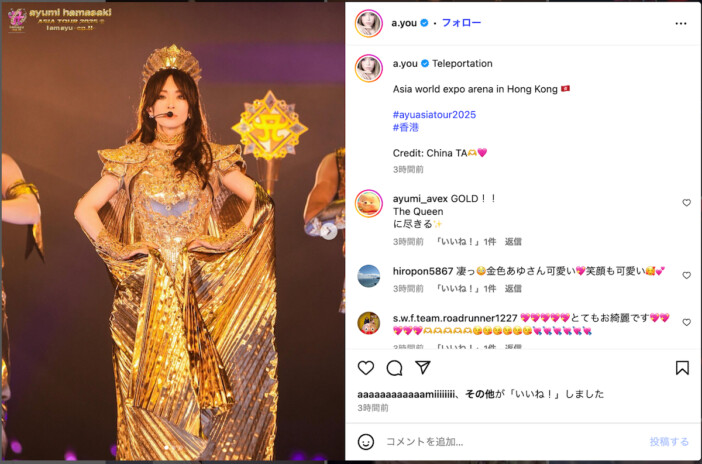 浜崎あゆみのアジアツアー『ayumi hamasaki ASIA TOUR 2025 A I am ayu -ep.Ⅱ-』愛知県芸術劇場 大ホール公演が、6月24日に開催されている。浜崎がライブに向けて自身のInstagramを更新した。