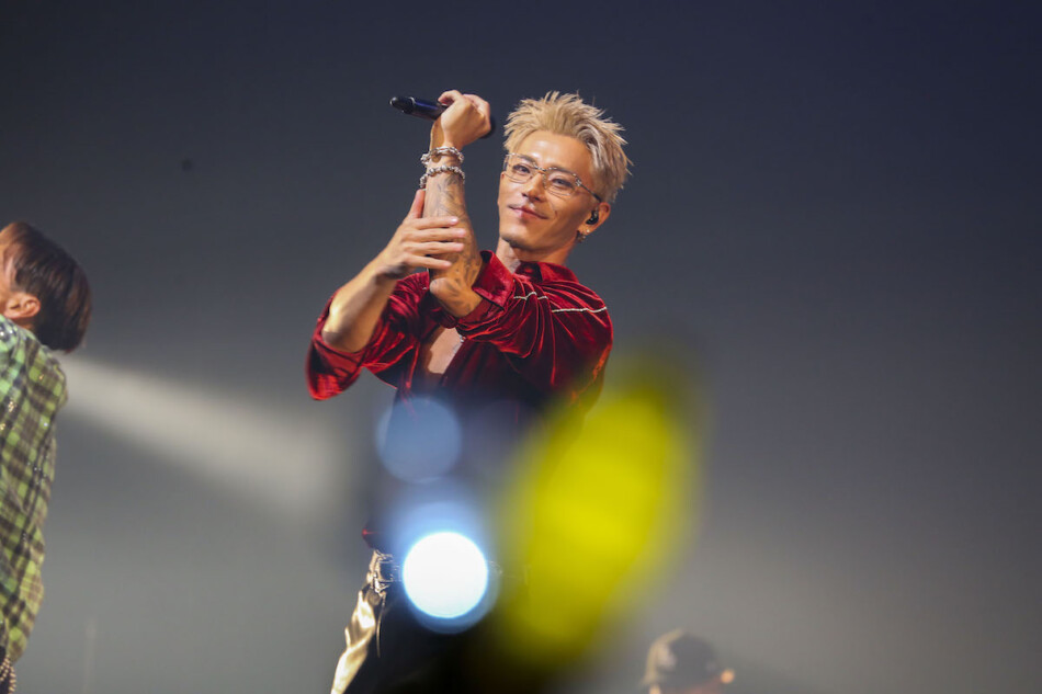 比較的ゆったりとした時間が続いたが、KUBO-Cのラップが際立つタイトでハードな「Backstage Freestyle」を皮切りに「そんぐらいの事だぜ」、曲名通り全員で飛び跳ねた「JUMP AROUND∞」で熱を再び高めていく。「FLAMMABLE」では、歌う前にGSが「メンバー3人の出身でもある関西、まだまだいけますよね!」と煽り「もう一回タオルで遊んでいきましょう。軽快なリズムに合わせて、みんなをこれから筋肉痛の旅へ連れて行きます!」と伝える。それに応えて全力で回したり、左右に大きく振ったりしたほぼ全員の皆さん、今も残るその痛みは誇りです。そこから「まだまだいこうぜ!」と「OH!YEAH‼︎」とサマーソングを続ける。ここでKAZUKIとSWAYが肩組んだシーンがまた良い。このアッパーな流れの締めは「マンマミーア!」。客席からの大音量のクラップが作る、果ての見えないエンドレスな盛り上がりにSWAYは「大阪最高だぜー!」と叫んだ。