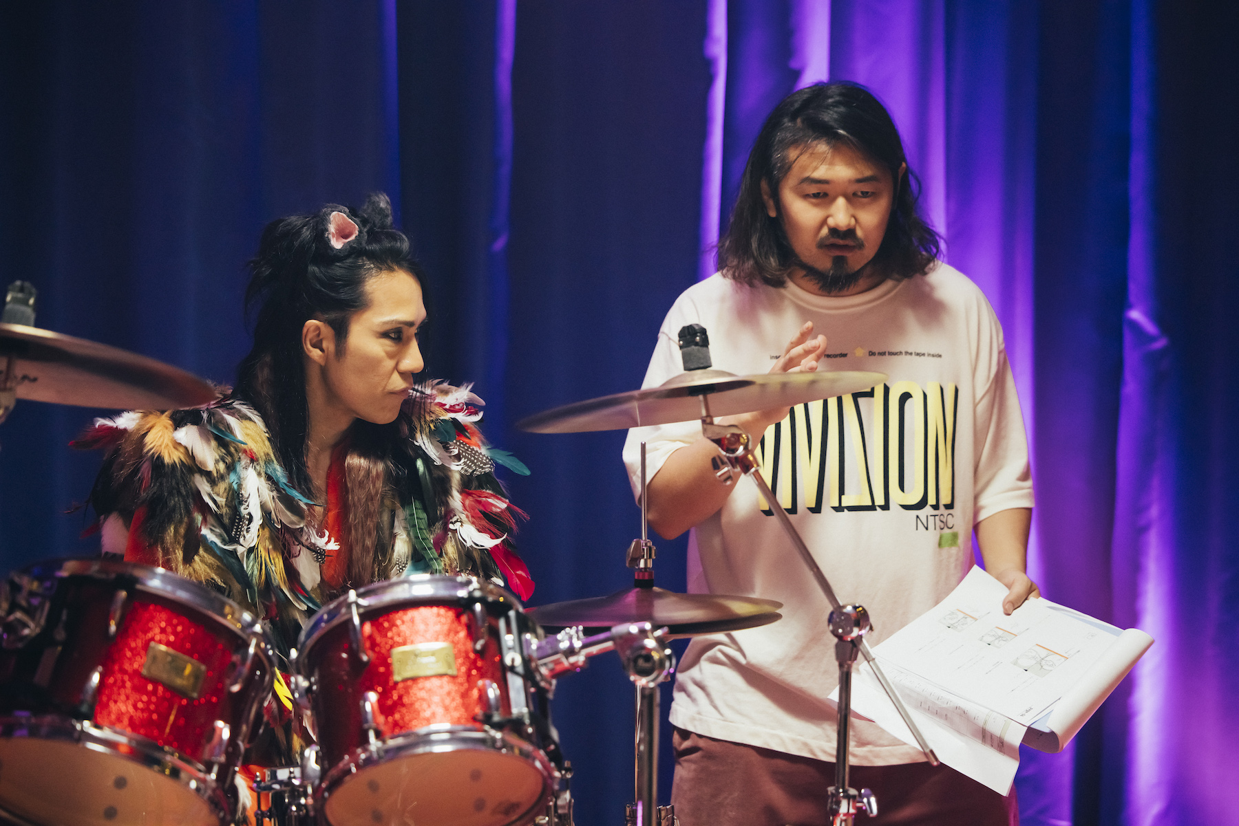 ここでセットチェンジし、窓のシーンへ。監督は、メンバーがこのあとつける猫耳の調整をしている。4人それぞれをイメージしながら作ったのだという猫耳は、まずサンプルを作成し、ツアーで多忙なスケジュールのなかにいるメンバーに渡して、実際に付けた写真を送ってもらうというやりとりがあったそう(監督曰く、「その度に猫になりきった表情とポーズの写真が送られてくるのが最高でした(笑)」とのこと)。そのうえで、メンバーそれぞれのジャストサイズの猫耳が生まれたのだ。その裏で、吉井は美術チームの微調整中に壁に掛かっているギターに近寄る。ひょいと手に取り、爪弾く。「今高いね」――チューニングをしていた。セットも完成し、吉井が位置につく。このシーンもさくさく撮影が進んでいった。