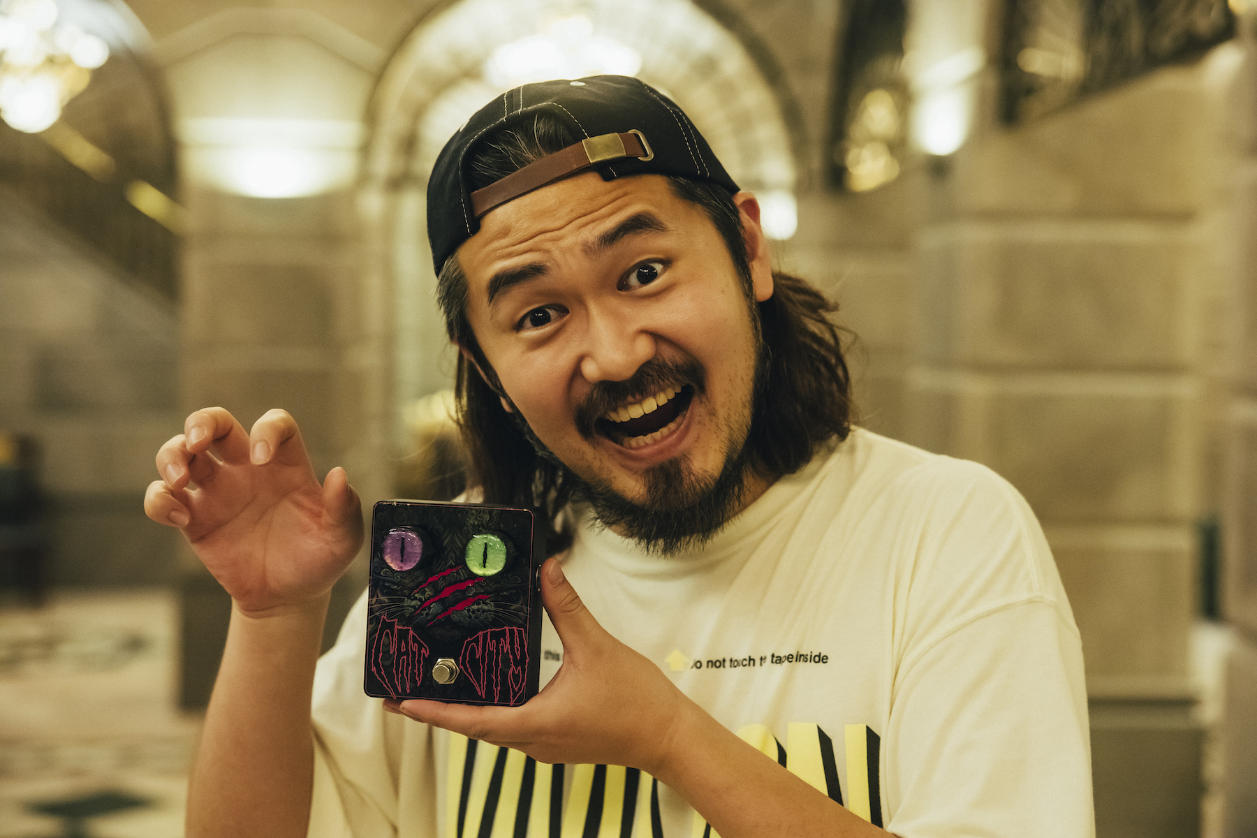 続いてはEMMAの撮影へ。彼の後ろに置かれているアンプは、ツアー『THE YELLOW MONKEY TOUR 2024/25 ~Sparkleの惑星X~』でもメインで使われていたもの。色合いもMVの世界観にちょうどマッチし、監督もぴったりだと言ってくれたのだという。グリーンバックでの演奏シーンから背景をチェンジしている間に、EMMAはゴールドのギターを爪弾いている。緑色のズボンと、ギターのゴールドによく似た色でジャケットの袖口にデザインされた豹柄を指しながら、「バイカラーにしました」と教えてくれた。撮影では、「ニャア」の顔で正面を向きながらも、手を動かして演奏しなくてはいけない。なかなか普段しないアクションに「難しい!」と言いながらも、無事に撮り終えたEMMAは安堵の表情だ。撮影を終え、話を聞かせてもらおうとすると、開口いちばんに「猫好きなので、猫になれてうれしいです!」と満面の笑みを浮かべる。猫好きのEMMAは、サンプル段階から耳の角度など細かくフィードバックを伝えていたのだという。曰く、「猫にはうるさい(笑)」と語る。