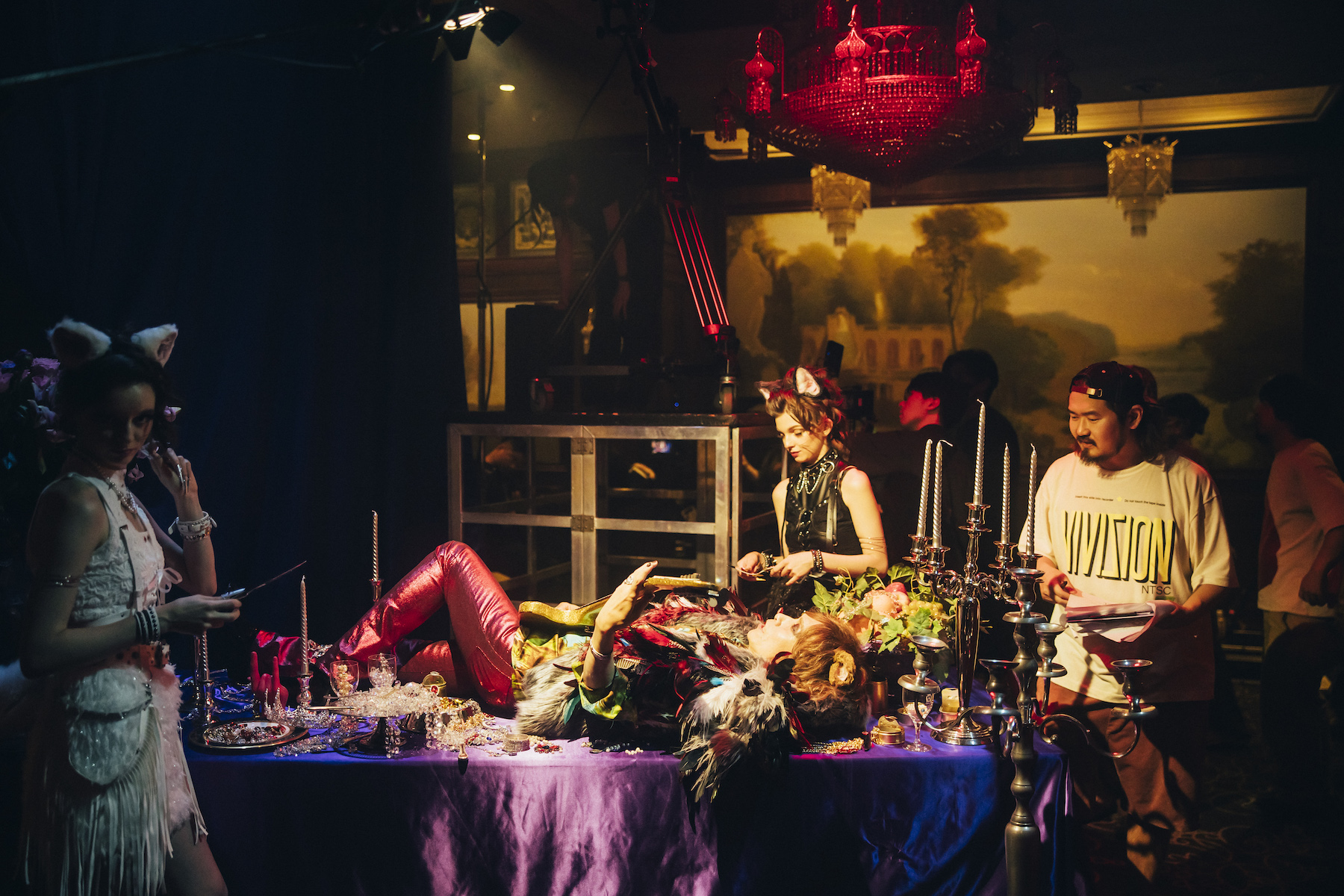 撮影は“猫の晩餐”シーンへ。絢爛豪華な装飾が施された食卓の上にメンバーが寝っ転がり、それぞれが食べられてしまうという画を撮っていく。カメラの位置を調整し、それにあわせて卓上の蝋燭、花、皿、宝石といった装飾も微調整が繰り返される。まずはEMMAがイン。監督の「EMMAさん、次は寝転びます!」という声に返事しながら、小さな声で「猫だけに?」とジョークを入れていく。吉井とANNIEも見学にやってきた。