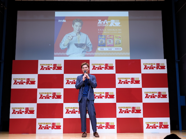 今回のアンバサダー就任に関して、EXILE SHOKICHIは「スーパー麺はもともと好きで食べていました。その良さをたくさんの方々に広められたらいいなと思っています」と笑顔を見せた。さらに、普段のトレーニングにも最適だといい、「食べながら体を作っていくのが何より大事です。長期的な体作りを考えるならスーパー麺はバッチリですね」「食を通じて、LoveとDream、そしてHappinessを届けたいです」と、アンバサダーとしての意気込みを語り、「今後、みんなに広められるようなイベントができたらいいなと思います」と今後の展望についてコメントした。