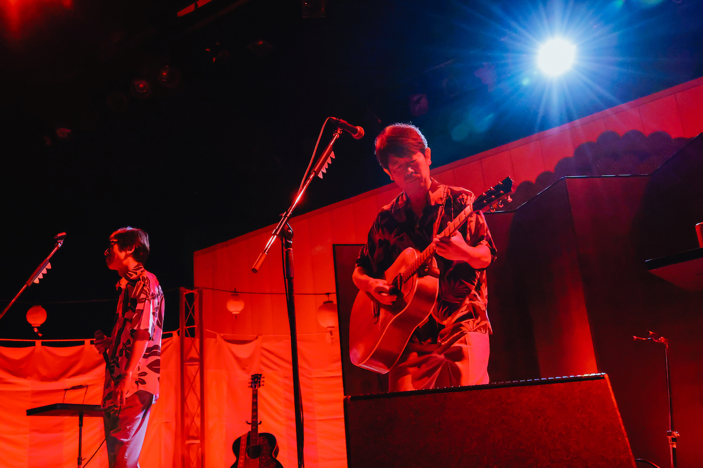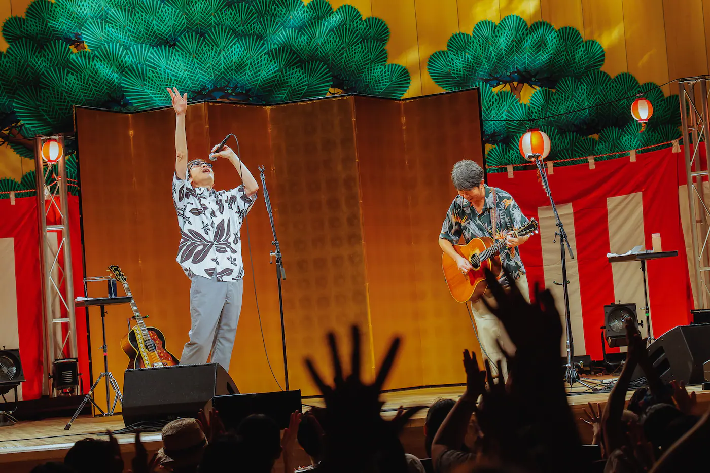 緞帳が下りたままの舞台にふらりと現れたふたりは、アロハシャツにスニーカーのラフな姿で、雑談トークで軽く笑いを取っておもむろに歌い出す。たぶんこれが前説のかわり。そして、緞帳が上がった向こうには、能楽でおなじみの松の絵、紅白の幔幕、金屏風に提灯、アコースティックギターと譜面台だけ。バンドなし、ゲストなし、電子楽器なし、等身大のショーの始まりだ。