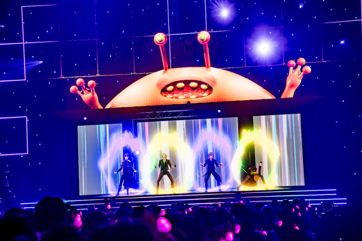 次に「ROF-MAOスペシャルメドレー」と題して8曲を一気に披露。まずは、加賀美ハヤト&甲斐田晴 from ROF-MAOとして歌った、ドラマ『先輩、断じて恋では!』(毎日放送)オープニング主題歌「Follow Your Heart」を、初めて4人で披露し美しいハーモニーを聴かせた。「前進宣言」では「お手を拝借!」と声をかけ、リズムに合わせて〈パンパンパパパン〉と手を打つ音が会場に響き渡る。そして疾走感あふれる「ウィーアーポップスター」は、〈ペガサス〉や〈フェニックス〉など歌詞に合わせたポーズもユーモアたっぷり。会場には大歓声とともに〈Go Go〉〈Hey〉と掛け声が広がった。メドレーを終えると甲斐田は「無事に終わって良かった。あんな曲からこんな曲まで、曲が増えたからできたこと。積み重ねを感じる」としみじみ語る。