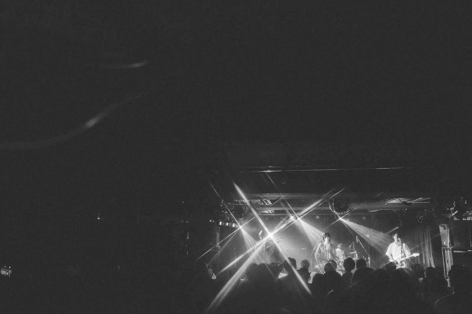 「水平線って、えらいバンドだよね。こんな年上のお兄ちゃんたちを誘ってくれて!」「なかなかいいバンドなんだよ!」と、水平線に対する愛のあるMCにフロアは拍手喝采。そんなリスペクトを感じ取れる言葉のあと、有馬は「特別な気持ちで渋谷に来てる。水平線とツーマンできてよかったぜ」とリズムに乗せて歌うと、「『SMILE』って曲やります!」と演奏をスタート。有馬とともに歌うオーディエンスの姿、その姿は本当に幸せそうで、フロアにはあたたかい空気と幸福感に溢れている。有馬があまりにも笑顔で歌うものだから、こちらもつられて笑う。笑顔は伝染していくのだ。彼らはここからギアをさらに上げてラストまで駆け抜ける。ステージを縦横無尽に動き回りながらスキルフルな演奏を見せた「FUNCLUB」も、「オジー・オズボーンに捧げます!」と始まった「正義の味方」も、すべてがアグレッシブ。おとぎ話の鳴らす音にオーディエンスは踊らされてしまっている。最後の最後まで笑顔で音楽を楽しんだおとぎ話の4人は、「COSMOS」をラストに投下し、有馬と牛尾がギターをステージの中心でクロスさせ、クールにライブを締め括った。