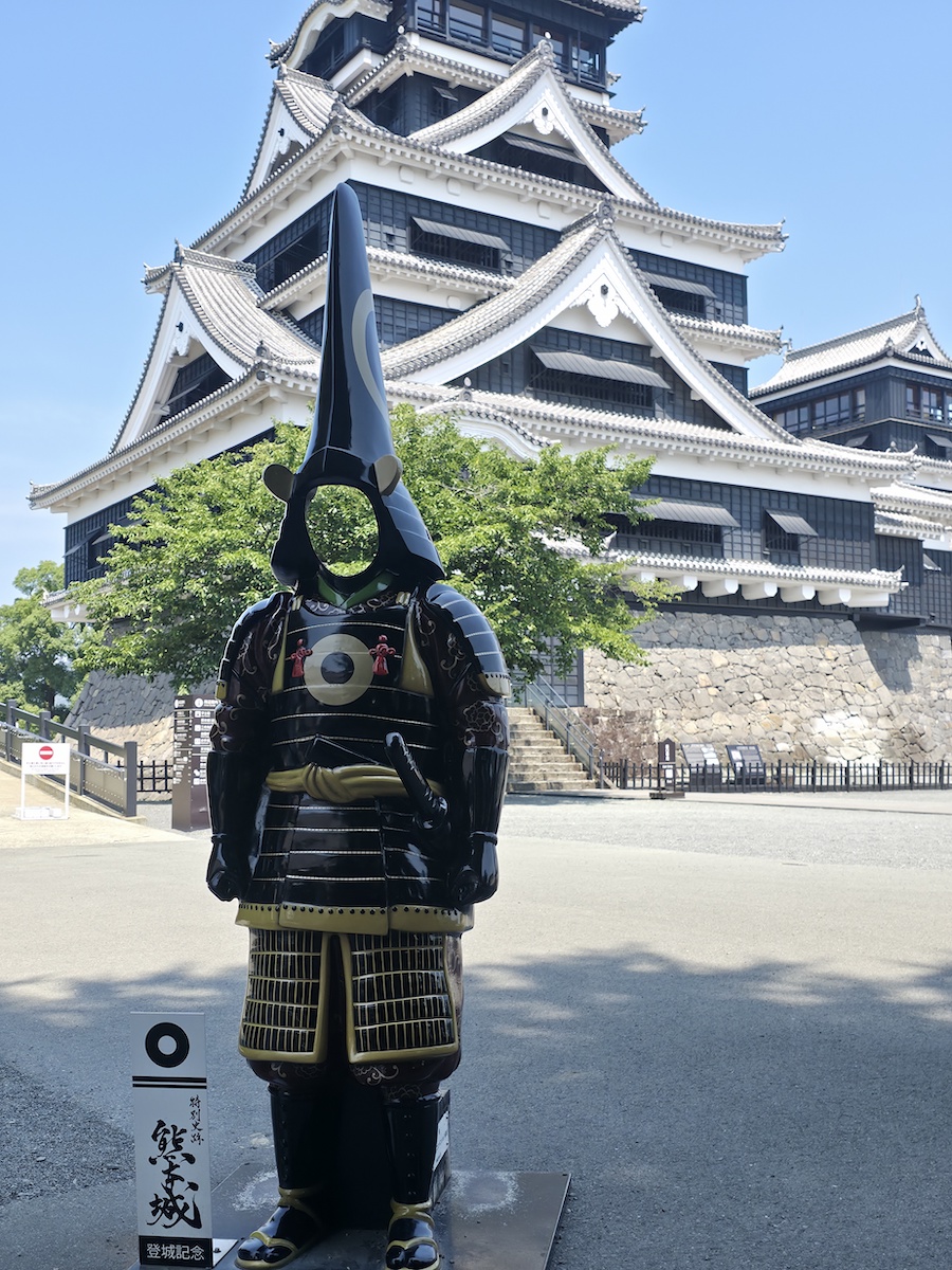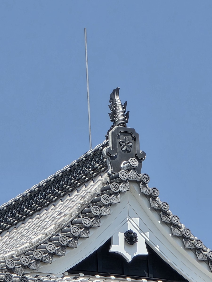 翌日は、会場近くにある熊本城へ。日本三名城のひとつに数えられる、日本を代表する城郭で、公演のMCでAyaseも訪れたと話していた。2016年に起きた地震での被害がいまだ石垣に見受けられる。AyaseがSNSにアップしていた顔ハメパネルにテンションが上がりつつ、熊本城に超望遠レンズを向けてみると、瓦に刻まれている桔梗紋まではっきりと確認することができた。