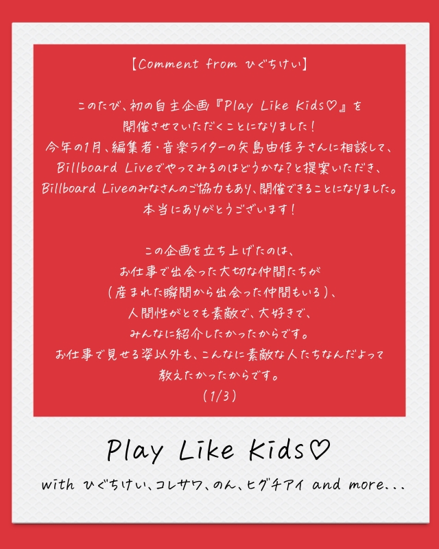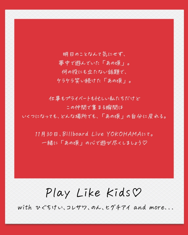 このたび、初の自主企画『Play Like Kids♡ with ひぐちけい、コレサワ、のん、ヒグチアイ』を開催させていただくことになりました!