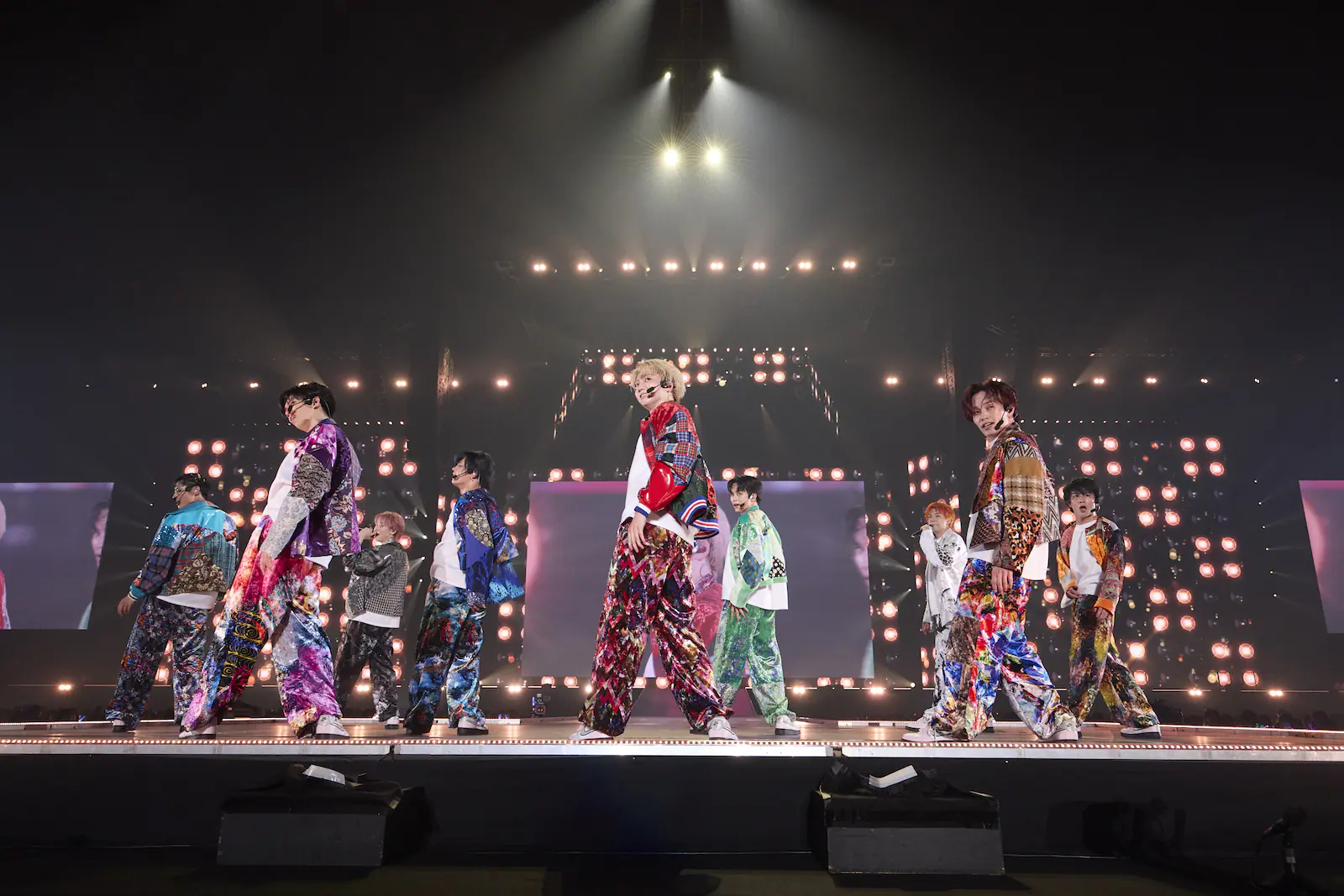 8号車のペンライトの光があまりにもきれいで、メンバーの表情を捉えるカメラの位置がわからないという嬉しい悩みを語り合い、さいたまスーパーアリーナの略称について議論を交わしたりもした最初の小休止となるMCを挟んで、多彩な曲がさらに届けられていく。ここから3つのユニットに分かれて楽曲を披露するセクションだ。タクヤ、ユーキのスタイリッシュなパフォーマンスが、タカシとシューヤが紡ぐ哀愁に満ちたメロディを奥行き深く表現した「霖雨」。続いて、カイ、マサヒロ、アロハのラップが「Re-Turn up」で力強く、響く。最後には「連れてくぜD・O・M・E!」とカイが言い切る。そこからバトンを受け取ったリョウガとハルは、「STYLE」と「Snow break」を披露。しかし、いつのまにかコメディタッチの寸劇を繰り広げ始めてしまう。そこから再び9人が揃ったステージは、「キャラメルハート」「My Buddy」「Jesus」によって明るいエネルギーを帯びた。幕間ムービーの直後に爽やかな盛り上がりを生んだのは、「a kind of love」。タカシとシューヤのみがステージに立ち、美しいハーモニーを響かせた「EBiDAY EBiNAI」は、バックボーカルであるふたりの黄金コンビネーションに浸らせてくれた。