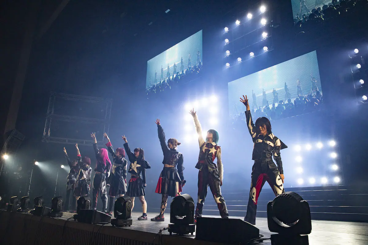 まず、この日は事前に告知されていたとおり、今年3月から体調不良で活動を休止していたナ前ナ以の復帰公演だった。ナ前ナ以が休みに入るのと入れ替わるようにして5月に加入したイコ・ムゲンノカナタを含めた7人体制で本ツアーを回ってきた彼女たちだが、ついにこの日、8人によるASPの“完全体”が姿を現した。当然、会場に集まったならず者(ASPのファンの総称)の鼻息は荒かった。実際、開演時刻となり、ステージ後方のスクリーンが上がるとともにその後ろから登場した8人の姿にはのっけから大歓声が飛んでいたし、1曲目「TOXiC iNVASiON」の2番のAメロでナ前ナ以のパートがくると、その歓声は一際大きくなった。8人が入り乱れるフォーメーションの中でその動きがビシッと揃うと、やはり圧巻。彼女たちの歌声と客席からの声がホールの壁や天井に反響して、会場は熱狂的な雰囲気に包まれていく。