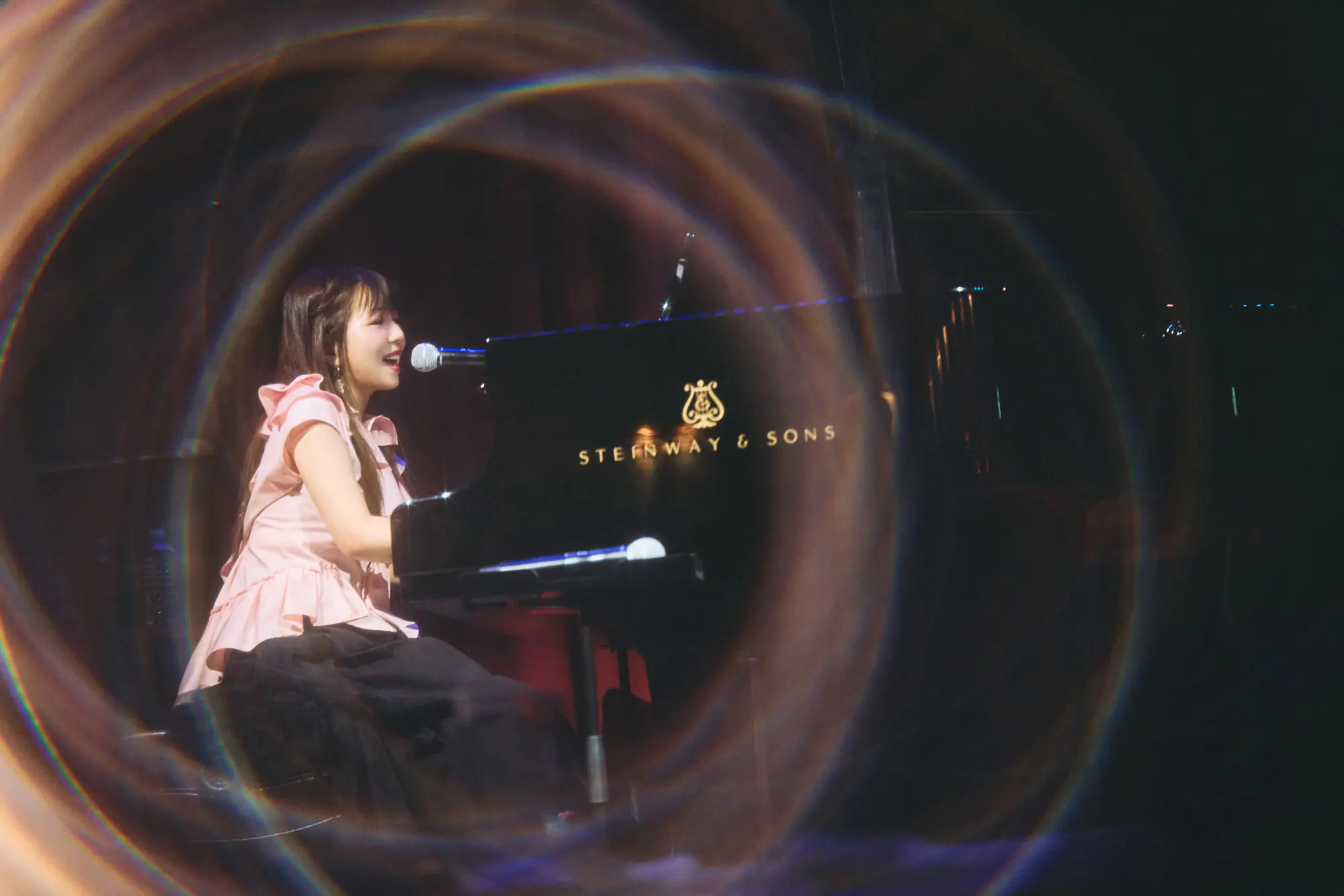 やがて、自然光を取り入れていた窓のカーテンが閉じられて、会場がシックなムードに包まれると、本日の主役である牧野がステージに登壇。グランドピアノの前に着席すると、1stシングルのカップリング曲「you are my love」を弾き語りでしっとりと届ける。彼女の本格的な声優デビュー作となったTVアニメ『ツバサ・クロニクル』(NHK教育テレビ)の挿入歌でもある同曲。作品の劇伴を手がけた作曲家・梶浦由記による憂いを帯びたメロディに、20年を経た今なおイノセントさを失わない牧野の特別な歌声が沁み込んでいく。