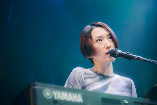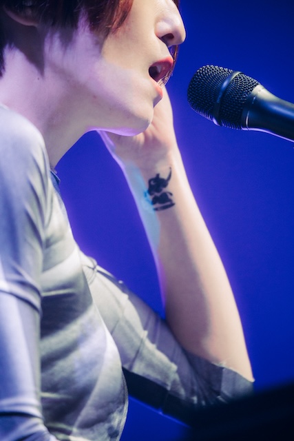 さて、至高の1曲「vacancy」である。ハッキリ言って、去年この曲を初めてライブで聴いた時には美し過ぎて腰を抜かした。真っ暗なステージを照らすのは、日食なつこの足元から伸びる慎ましいライトだけ。彼女の顔は見えない。まるで鍵盤と歌だけが宇宙にぽかんと浮かび上がってくるような弾き語りである。しかし次第に声は熱を帯び、気づけば中盤からギター、ベース、ドラムが合流。空間を広く使ったサウンドはまさに今の日食なつこに相応しいスケールがあり、エモーショナルなアンサンブルが胸を熱くさせる。しかしこの曲の静謐さは最後まで失われない。なんというか、目の前で大きな音が鳴っているのに、むしろ静けさを感じるような不思議な楽曲である。