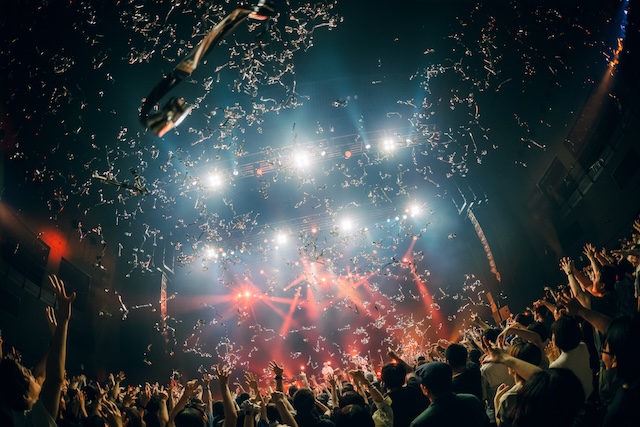ここからはもう終盤、本当にあっという間のクライマックスである。お客さんを立たせて歌った「leeway」からは明らかに会場のボルテージが上がり、「イー アル サン スー!」のカウントで始まった「LAO」はめちゃくちゃ踊れる1曲に。力強く牽引してくれるベースにどことなくニヒルな印象を思わせるギターフレーズ、そしてテクニカルに刻まれる軽快なドラムに華のある鍵盤と、鉄壁のアンサンブルが腰を刺激していく。会場中からコーラスが聴こえる「ログマロープ」ではお客さんとハイタッチする日食なつこが印象的で、銀テープが降り注ぐ演出も相まってこの日一番の興奮が会場を包み込む。以前取材した際には「(この曲を書いたのは)いちばんお金がない時代(笑)」と語っていたが、苦しい時期に書かれた楽曲が今これだけ晴々しい景色を作り出しているのだ。その勢いのまま「五月雨十六夜七ツ星」、「真夏のダイナソー」を歌って終演。もちろんアンコールはなし。最後まで潔いライブである。