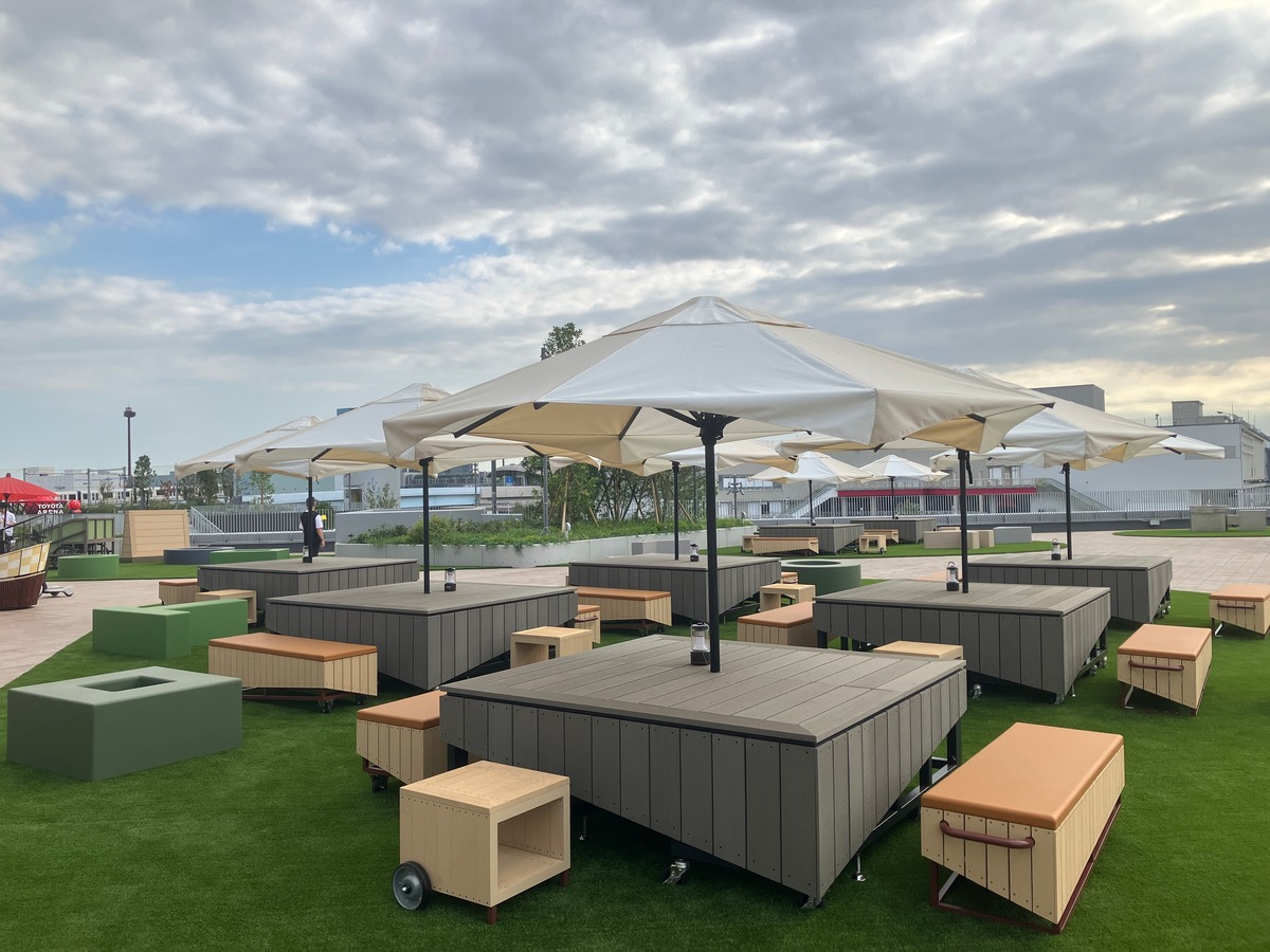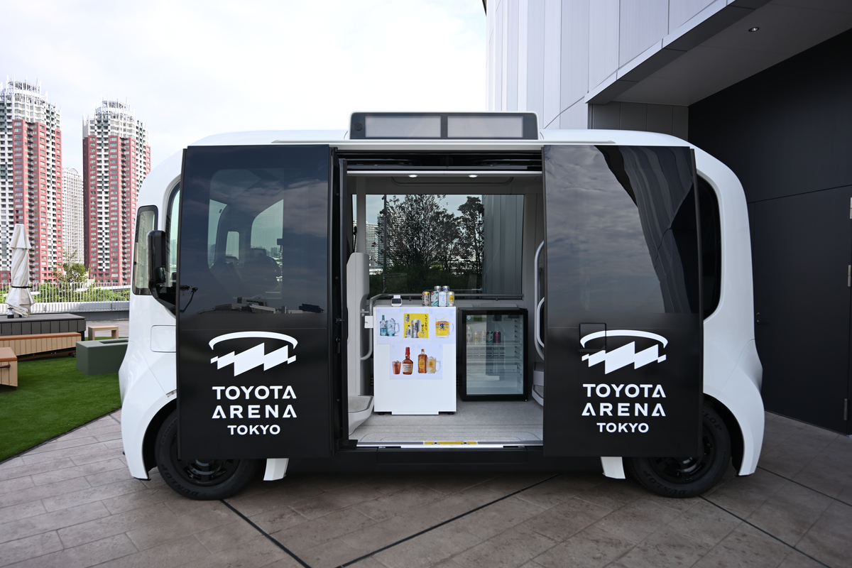 なかでも筆者が目を見張ったのは、屋外エリア。飲食・休憩スペースが充実しており、ライブの開演前などにくつろげる場として重宝されていく予感がする。TOYOTA ARENA TOKYOのシンボルモニュメントを横目にして、会場と隣接されているのは、様々な用途に利用可能な屋外パーク「JOINT PARK」。この日の内覧会では自動運転コンセプトカー「e-Palette」を無人店舗として活用した「e-palette ショップ」をはじめ、トヨタグループの次世代モビリティが並んでいた。アルバルク東京の試合時はキッチンカーを設置予定とのことだが、音楽ライブの場合どのように使用されるかは、興行主の判断になるとのこと。