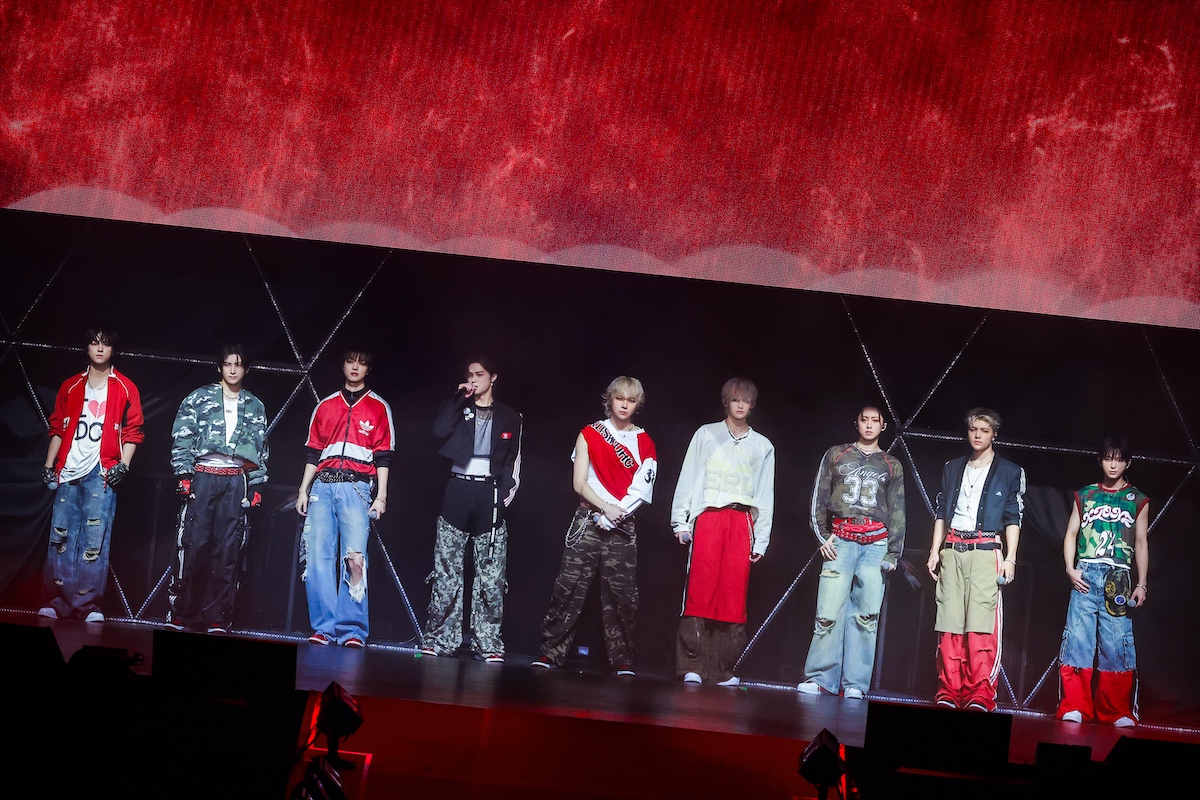 グループ3周年記念日となるこの日の公演は、「W.O.L.F (Win Or Lose Fight)」のパフォーマンスでスタートした。「Run Wild」の後、昨日の公演では「Burning Up (FIRE)」、昼公演は「Run」とBTSの楽曲がカバーされてきたが、本公演では「MIC Drop」を披露。9人の気合に満ちたアグレッシブなパフォーマンスに、会場は一気に熱気に包まれた。