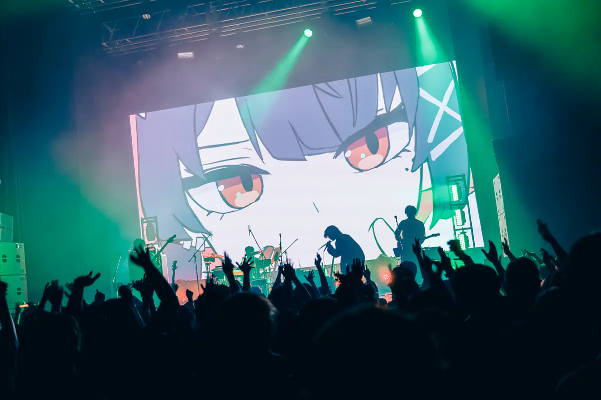 「タンゴ!」と快活に声の合った観客たちに向けて、アコーディオンが豊かな響きを奏でる「よなべのタンゴ」が繰り出されると、ギターをかき鳴らす弌誠。ユーモラスな世界が幕を開ける。フロアに視線を投げ、今この瞬間を観客と分かち合おうとする姿が目に焼きついた「謝祭」は、祝祭でありながらもどこか影を孕む。彼の紡ぐ音楽には、狂気めいた色がしみ出しながらも、寂しさや薄闇、そして時折触れる温もりがある。「なんだか眠そうですね」「はろー。」と続いた2曲は、そんな心のよりどころを求める優しい響きとして漂った。アクションRPG『鳴潮』に登場するザンニーのキャラクターソング「デビデビデビット」では、ライブならではの大胆なアレンジが光り、ボーカルの色気が増幅されていたのも良かった。