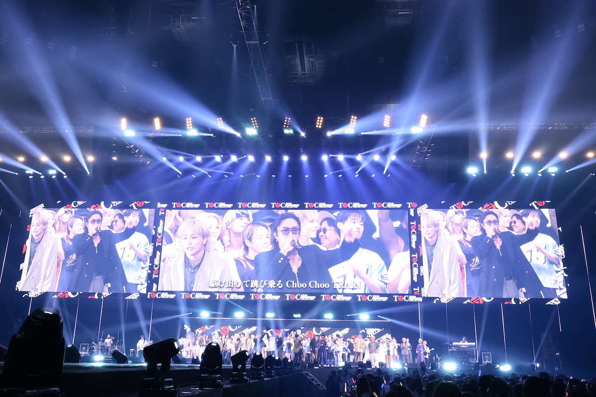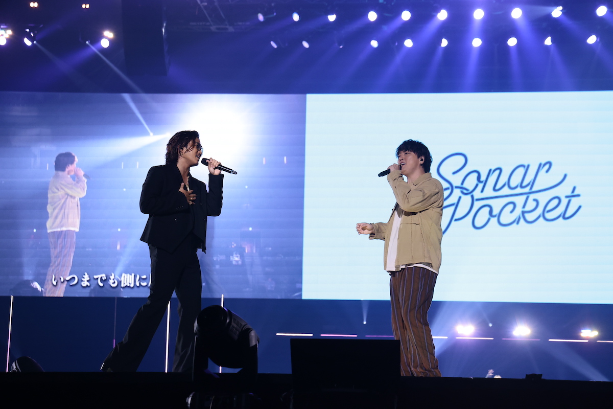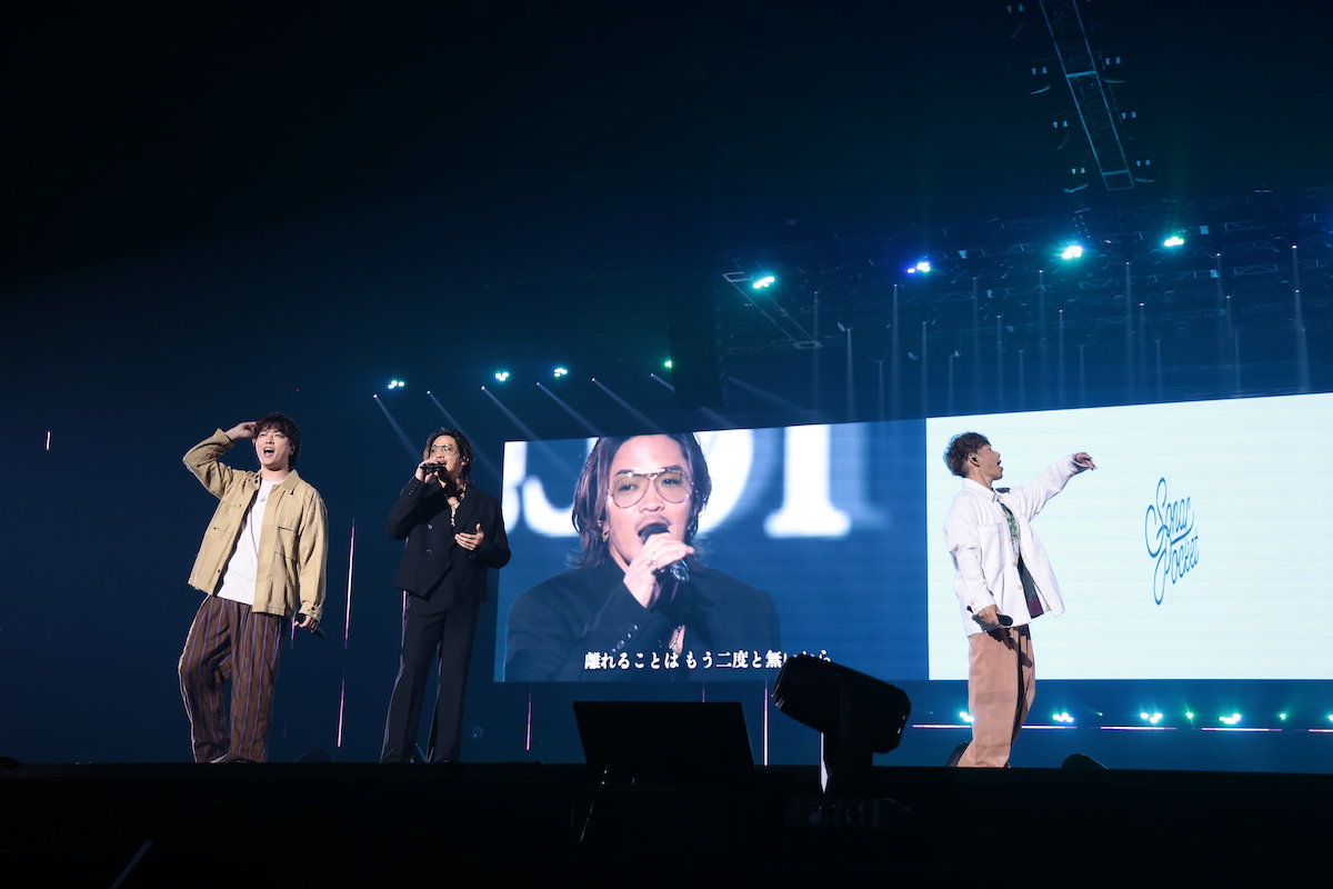 とはいえ、メンバーだけでここまで進んできたのではなく、もちろん、長い道のりにはたくさんの仲間の存在があった。その1組が、同じ時代を駆け抜けてきたDa-iCE。サプライズゲストのDa-iCEが「スターマイン」「ノンフィクションズ」を歌唱した後、2組による初のコラボ曲「Grounds」も初披露された。同曲は、かねてより交流があったDa-iCE 工藤大輝と白濱の、2人で作詞作曲を担当。2024年開催された『a-nation 2024』でのコラボパフォーマンスをきっかけに作り始めたという楽曲に、Da-iCE和田颯と中務が振りをつけ、4ボーカル・7パフォーマーの総勢11名によるパフォーマンスが完成した。順風満帆ではない月日を重ねてきた2組が、今、共に大きなステージに立っているという事実が、曲が持つメッセージをより鮮やかに心に刻んでいく。共通点が多い2組だが、終演時間が差し迫ってもなお、マシンガントークが止まらないところもソックリだ。