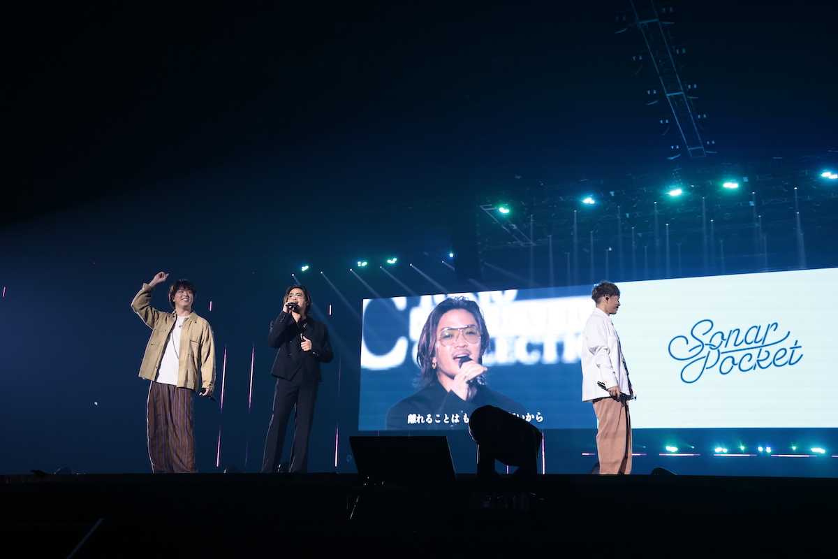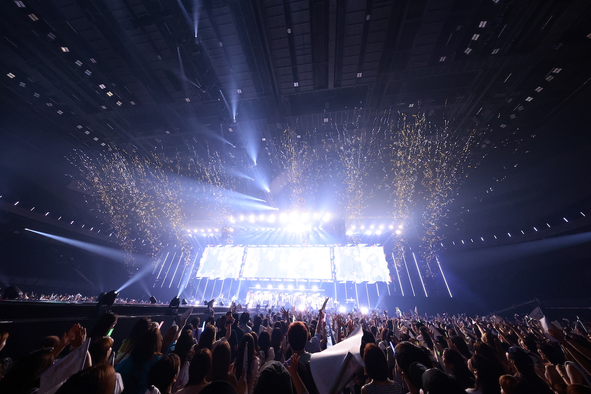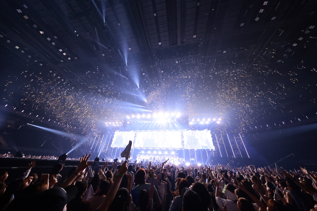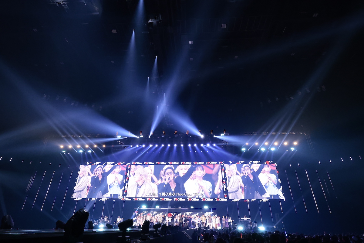 とはいえ、メンバーだけでここまで進んできたのではなく、もちろん、長い道のりにはたくさんの仲間の存在があった。その1組が、同じ時代を駆け抜けてきたDa-iCE。サプライズゲストのDa-iCEが「スターマイン」「ノンフィクションズ」を歌唱した後、2組による初のコラボ曲「Grounds」も初披露された。同曲は、かねてより交流があったDa-iCE 工藤大輝と白濱の、2人で作詞作曲を担当。2024年開催された『a-nation 2024』でのコラボパフォーマンスをきっかけに作り始めたという楽曲に、Da-iCE和田颯と中務が振りをつけ、4ボーカル・7パフォーマーの総勢11名によるパフォーマンスが完成した。順風満帆ではない月日を重ねてきた2組が、今、共に大きなステージに立っているという事実が、曲が持つメッセージをより鮮やかに心に刻んでいく。共通点が多い2組だが、終演時間が差し迫ってもなお、マシンガントークが止まらないところもソックリだ。