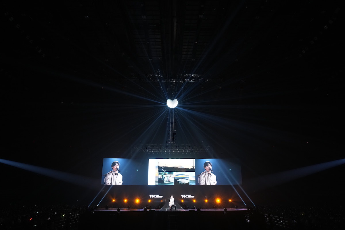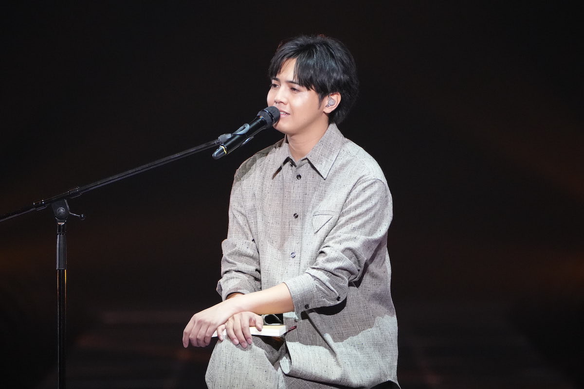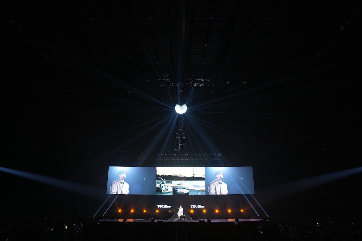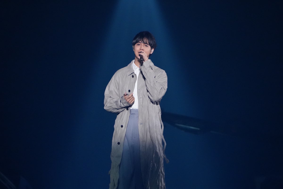 MVとリンクした大自然の映像を背にして、片寄がそっと歌い始めた1曲目は、1stソロアルバム『Bouquet』に向けて自ら書き下ろしたミディアムナンバー「朝日のように、夢を見て」。シンガーソングライターの土岐麻子が手掛けた「Smoky Town Rain」、シンガーソングライターのTani Yuukiが手掛けた「運命」へと続く。「Smorky Town Rain」の曲中には、ランウェイを歩きながら歌う片寄の頭上をフライングハートが舞った。「ソロでは、多くのアーティストと一緒に作品を制作していきたい」と常々語っている彼だが、それは楽曲に留まらず、このフライングハートも、「感覚の蘇生」をテーマに香りと音を芸術表現に用いるアーティスト・和泉侃がプロデュースした“香り”をプレゼントするためのロマンティックな仕掛けだという。「運命」の歌唱時には、佐藤充がアルバム『Bouquet』から着想を得て描いた絵画もスクリーンに映し出され、さまざまな角度から感性を刺激する新感覚のライブ体験を届けた。
