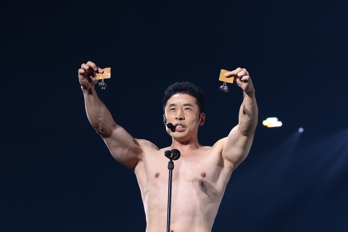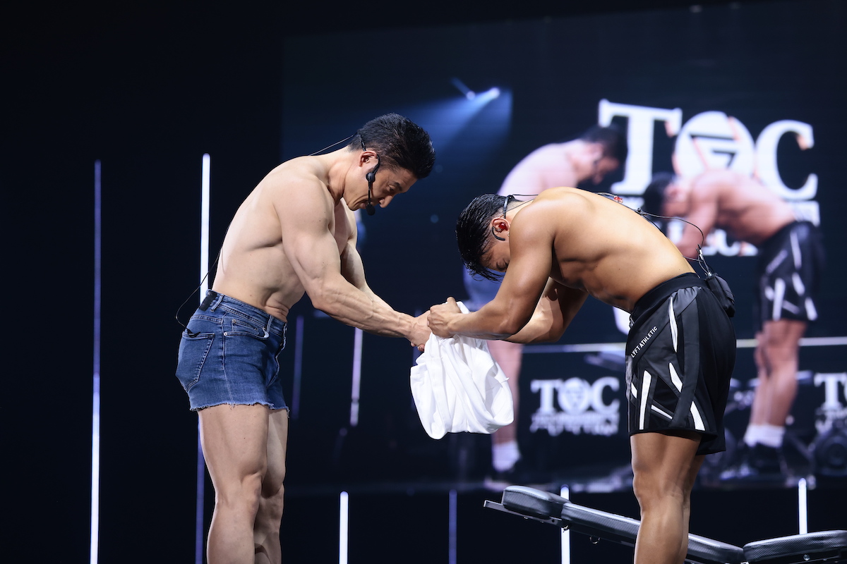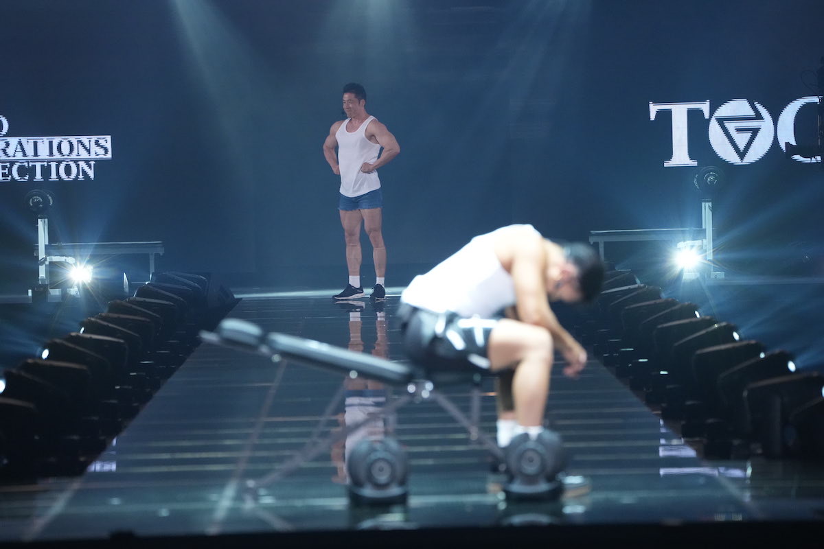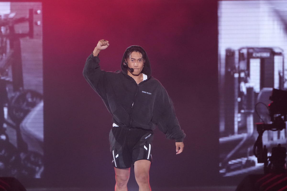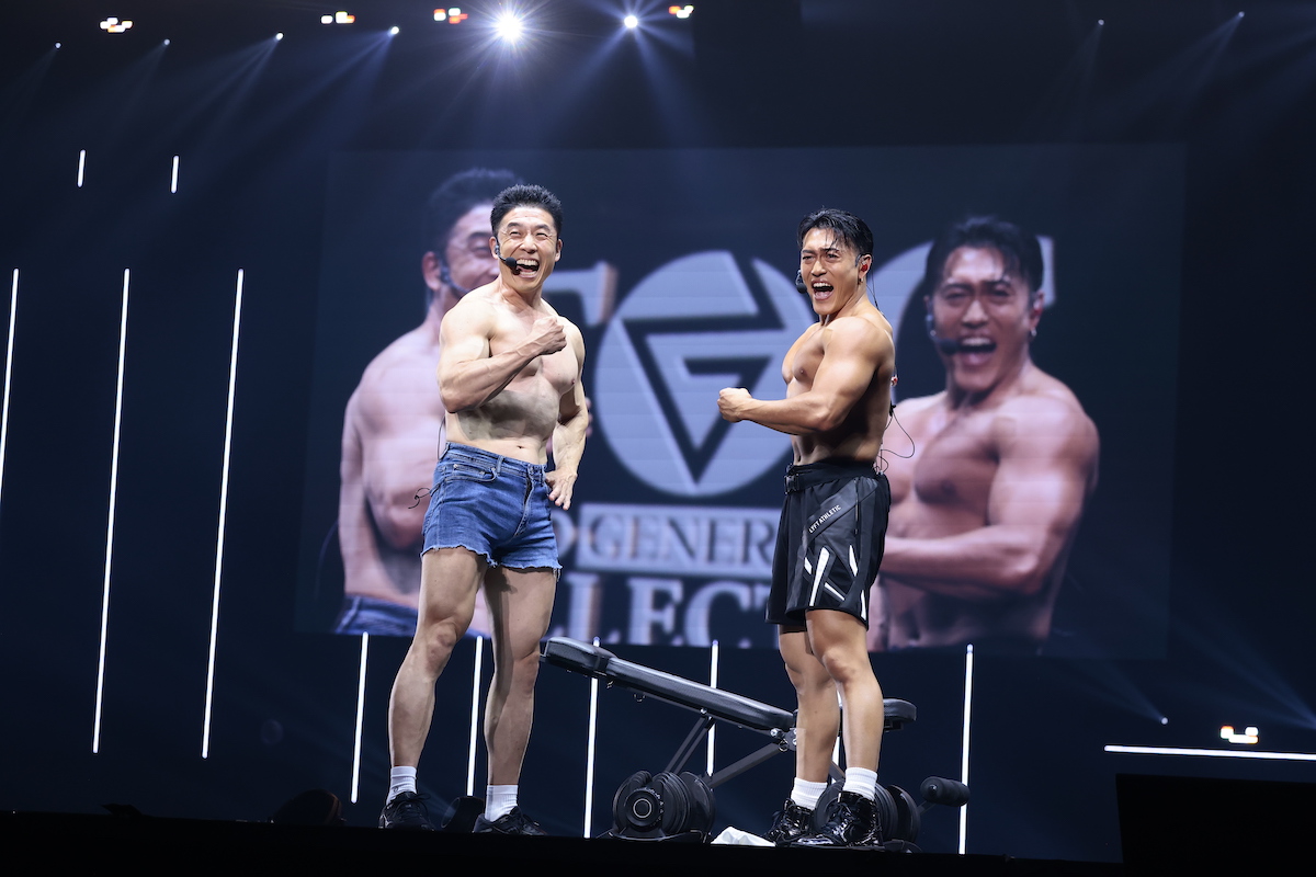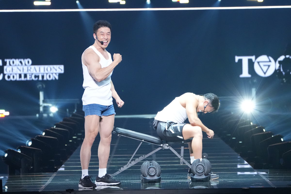 しかし、良い意味で綺麗にまとまらないのが、GENERATIONSの面白いところ。幕間のTALK STAGE(総合MC・片寄・佐野)に登場したメンバーたちは、次のブロックへの期待が抑えきれない様子で笑みを浮かべる。――そう、筋肉自慢の中務がアパレルブランドLYFT と贈る、マッスル×ランウェイの新境地『MUSCLE COLLECTION STAGE』の時間がやってきたのだ。ステージ上に本格的なトレーニング機材が設置してあることだけでもかなり新鮮なのだが、LYFT提供のウェアを着用したマッスルモデルたち(Ayaka・KIKI・KOKI・KC from RAG POUND・SHIHO・YUSHI・KANG YUNO)は、美しい姿勢で筋トレをしたり、ポージングを取りながらランウェイを歩き、観客を新たな世界へ誘う。そこに満を持して登場した中務は、王者のような風格を醸していた。でも、少しの筋トレで早くもエネルギー切れを起こし、うなだれてしまう。それを見かねて駆けつけたのが、筋肉芸人・なかやまきんに君。彼が観客と共に“筋肉三々七拍子”でエールを送ると、みんなのおかげで力が漲った中務は、片腕24kgのダンベル×2を10回高く突き上げてフィニッシュ!マッチョ2人によるキメポーズ「やぁーーー!」が、ツッコミ不在のコントを締め括るように響き渡った。